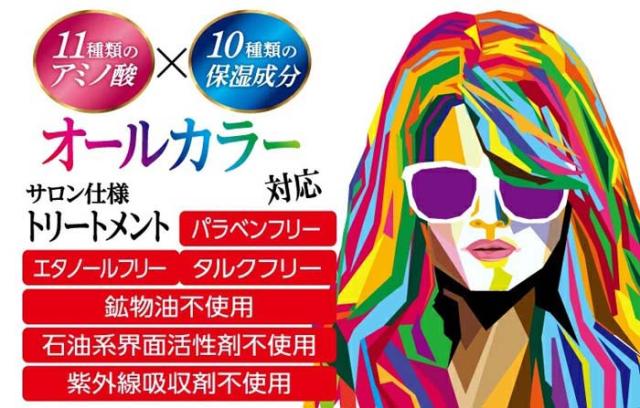 | トリプルレインボー カラートリートメント 11種類のアミノ酸×10種類の保湿成分がカラー後の傷んだ髪に 潤いやツヤを与えます。トリートメント成分が髪表面をコーティングすることで褪色を防ぎ、美しい髪色を持続させます。 ●パラベンフリー ●エタノールフリー ●タルクフリー●鉱物油不使用 ●石油系界面活性剤不使用 ●紫外線吸収剤不使用 |