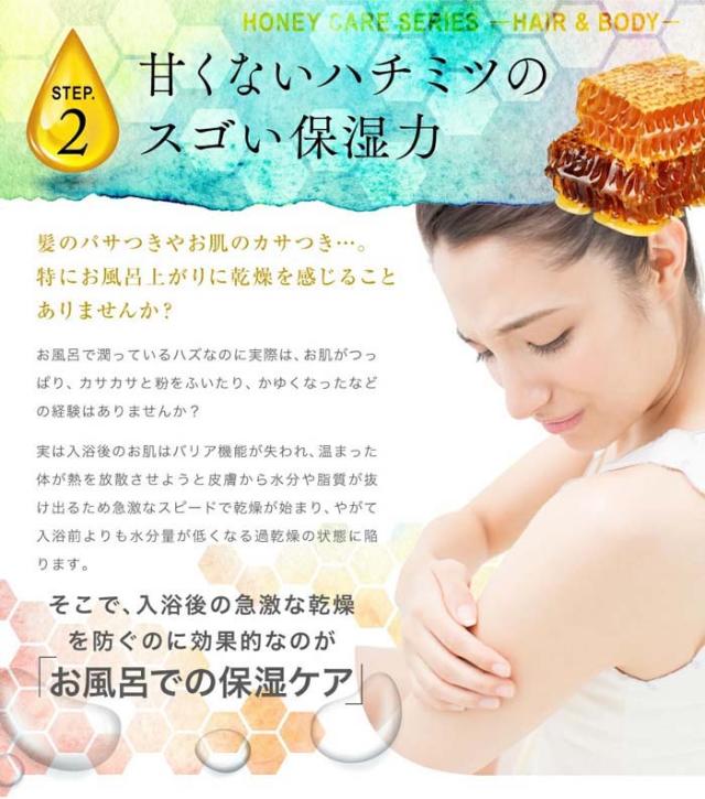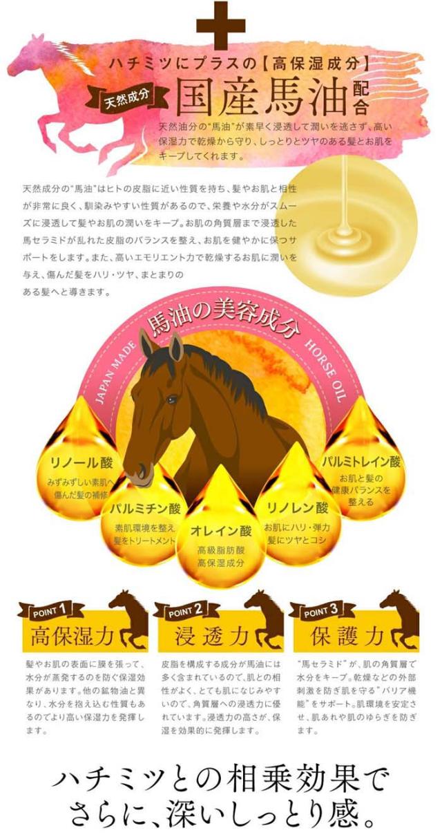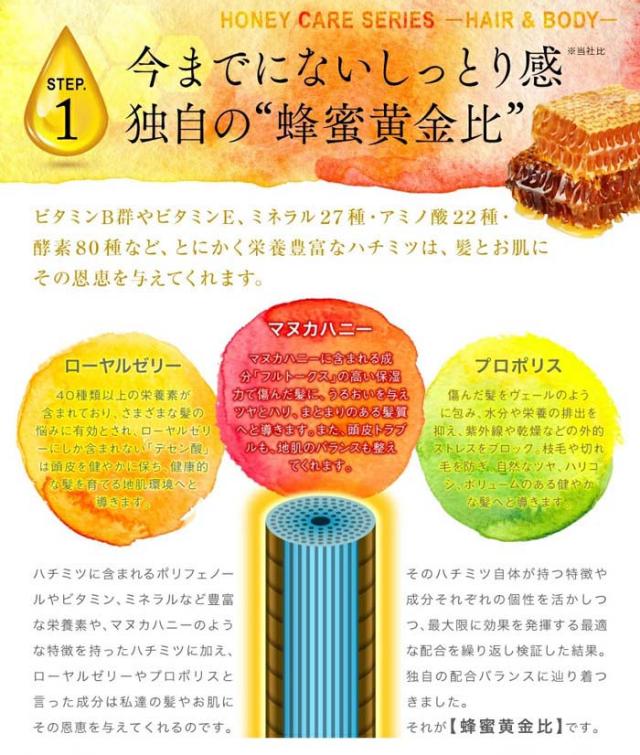 | 7つのハチミツ由来保湿成分 配合 ●マヌカハニー ●国産ハチミツ ●ハチミツエキス ●プロポリスエキス ●ローヤルゼリーエキス ●ハチミツ発酵液 ●サッカロミセス こだわりの蜂蜜黄金比 蜂蜜の美容効果を最大限に活かすために生まれた当社独自配合!更に国産馬油も配合し、髪のダメージケア力アップ!! |