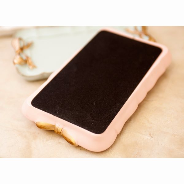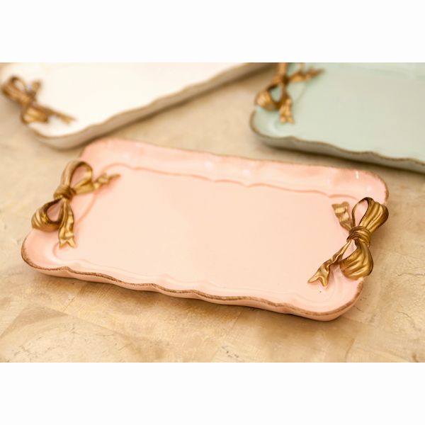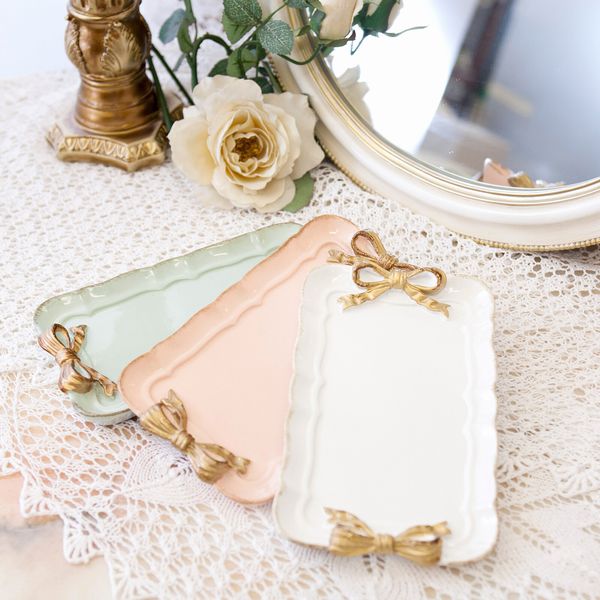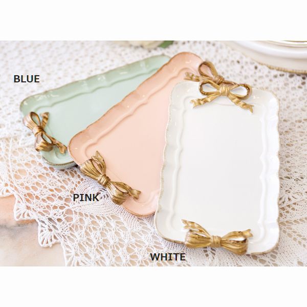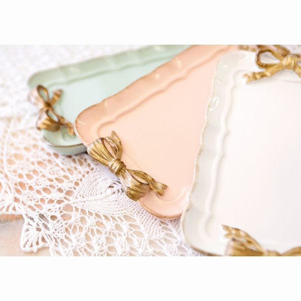 | かわいいパステルカラーのトレイです。 サイドのゴールドリボンがワンポイント! アクセサリーや小物などをオシャレに飾ってみてはいかがでしょうか。 金で縁取られた可愛らしいシリーズです。 |