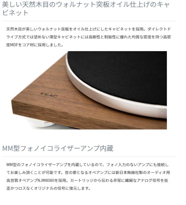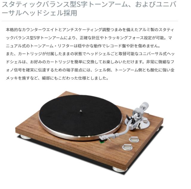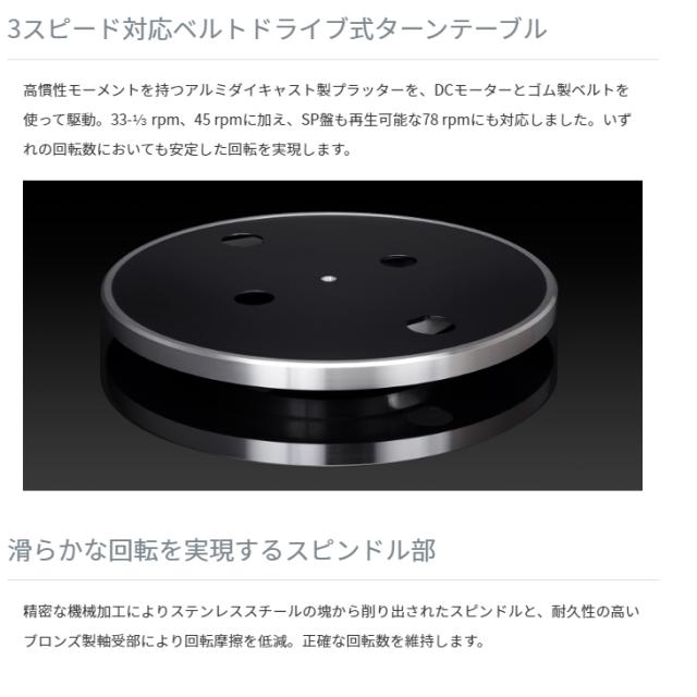 安定した回転を実現するアルミ・ダイキャスト製プラッターや、簡単に好みのカートリッジに交換できるユニバーサル型ヘッドシェル、アンチスケーティング調整機構付きスタティックバランス型S字トーンアームを採用するなど、基本性能を重視したモデルです。さらに内蔵のMM型フォノイコライザーアンプによりフォノ入力を持たないオーディオシステムとの接続も可能となっています。