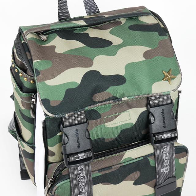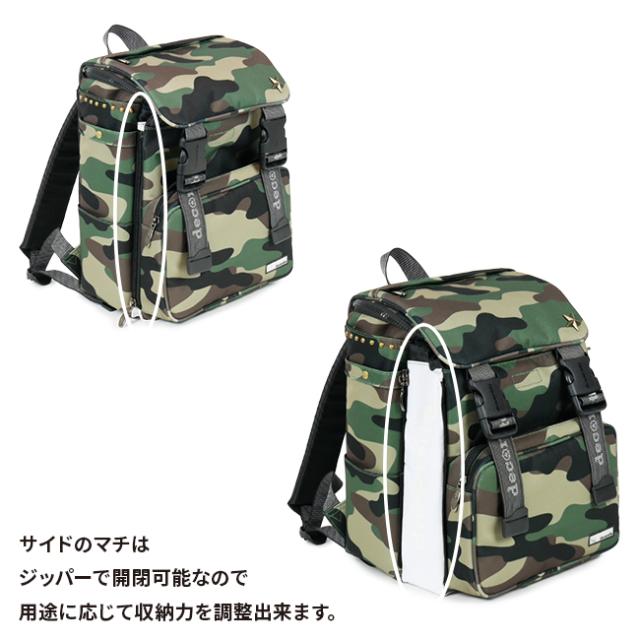 | 定番のウッドランドカモ柄ながら、ハードになり過ぎない色味にて作製したdecorateオリジナルのカモフラージュ柄。カブセ部分と左右のサイド上部に施されたスタッズがポイントです。男の子女の子を問わずお使いいただけるカモフラージュ柄は、お洋服との相性も気にせずお使いいただけます。 メイン収納口がファスナータイプの【Heartful】タイプですので多くのみなさまにピッタリとフィットします。タブレットスリーブを完備しているのでオンライン&リモートスタイルにも対応可能です。サイドのマチはジッパーで開閉可能なので用途に応じて収納力を調整出来ます。レインカバーはカブセ部分に標準装備です。 ※商品ページではMサイズ、Lサイズ共に同じ画像を使用しております。 |