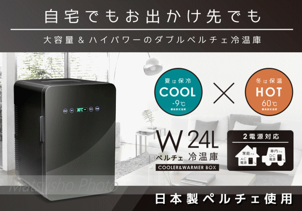 大容量でハイパワーなダブルペルチェ冷温庫!冷たいものは保冷、温かいものは保温できる24リットルの冷温庫。電源もAC・DCの2電源方式でご家庭でも車内でも使用可能!さらに本体上部に持ち手があるので自宅のお部屋・レジャーでの車内・旅先のホテル等に持ち運べて冷たい飲み物、または温かい飲み物を手軽に楽しめます。棚板は取り外して水洗い可能なので衛生的にもGOOD。■本体寸法約W310×D375×H460mm■本体重量約8.0kg■電源AC100V 50/60Hz、DC12V■消費電力[AC]保冷88W/保温65W[DC]保冷73W/保温62W■運転音[保冷]約42〜44dB[保温]約42〜44dB■設定温度-9〜60℃(設定できる温度)■推奨環境温度20〜25℃■容量約24リットル■冷却方式:ペルチェ方式■コード長さ[AC電源]約1.5m[DC電源]約1.8m■材質[外装]ABS+鋼ガラス[内装]ABS+アルミニウム※大型商品のため同梱発送不可【冷蔵庫(170L以下) 家電リサイクル料金】リサイクル料5092円(税抜4715円) +収集・運搬料金3240円