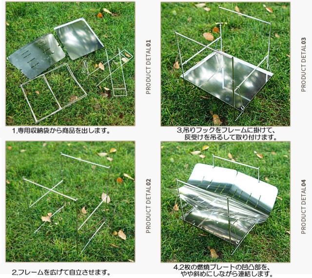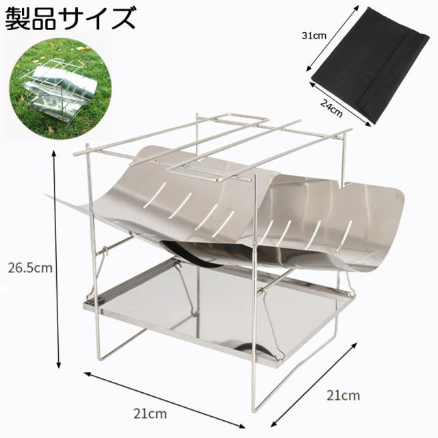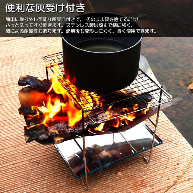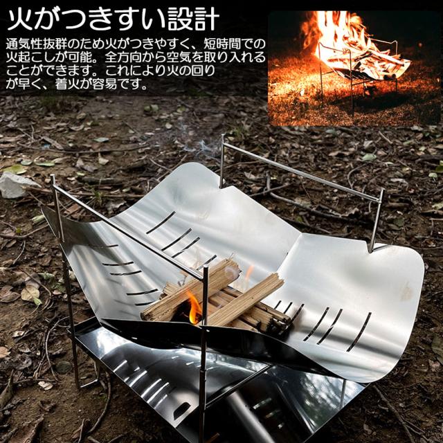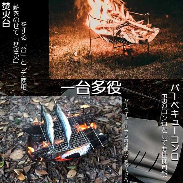 【焚き火台 製品仕様】焚火台は耐久性に適したステンレスで作られています。サイズ:収納時 31x24x2.5cm,本体重量約800。【焚火台 一台多役】バーベキュー網(付属しておりません)をのせ、炭火でバーベキューできますし、バーベキュー網を外して薪を燃やせば、焚き火台に変身。