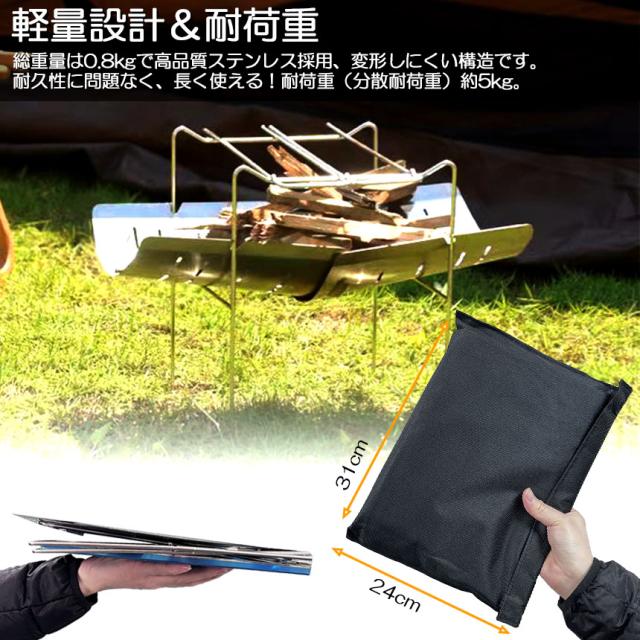 【焚き火台 製品仕様】焚火台は耐久性に適したステンレスで作られています。サイズ:収納時 31x24x2.5cm,本体重量約800。