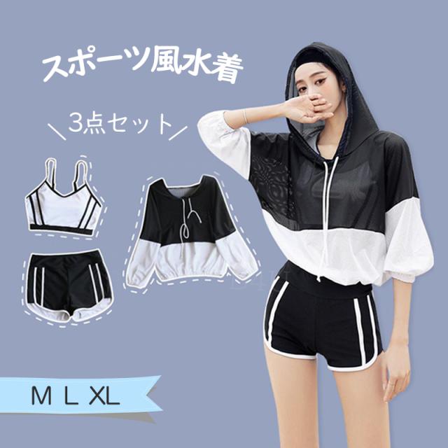 3点セット 水着 半袖 レディース 体型カバー スポーツ風 セパレート 黒 白 春 夏 無地 韓国風 細見せ ビキニ パッド付き フィットネス水着 露出控えめ ハイウエスト 運動風 女性 大人 可愛い 盛れる おしゃれ アウトドア 海 海水浴 プール ビーチ 旅行 温泉 学生