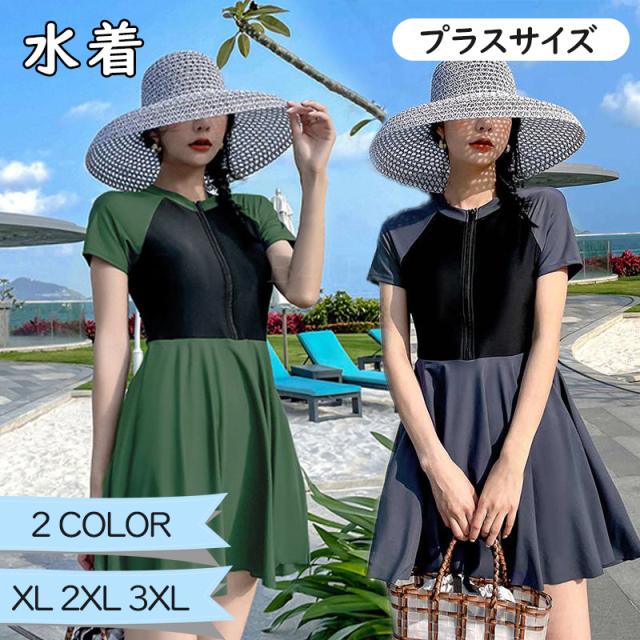 水着 半袖 プラスサイズ ぽっちゃり 競泳水着 ワンピース水着 体型カバー 運動風 一体式 レディース Aライン 春 夏 無地 細見せ フロントジップ パンツ付き パッド付き フィットネス水着 露出控えめ ハイウエスト スポーツ風 女性 おしゃれ 海 ビーチ 旅行 温泉 学生 快適