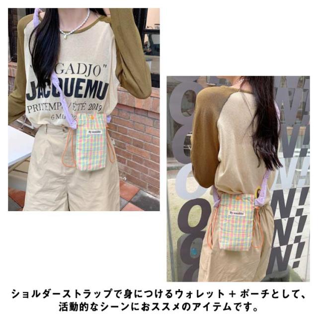 | マルチチェック柄のカラフルなスマホポーチ。 コットン混を採用し、ナチュラルな仕上がりでロングシーズン使用できます。 紐の長さが調整できるのでお好きな長さでお使いいただけます。 ショルダーストラップで身につけるウォレット + ポーチとして、活動的なシーンにおススメのアイテムです。 ちょっとしたお買い物はもちろん、サブバッグとしても◎アクセサリー感覚でお使いいただけます! | |