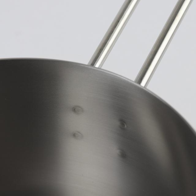 サビや焦げ付きに強いステンレス製です。アルミのように変色しないので、食材や調味料を選ばず、どんな料理にも使いやすいのが特徴です。また、持ち手部分は溶接で接続されており、ネジ留めの場合よりも汚れが溜まりにくくお手入れがしやすいです。