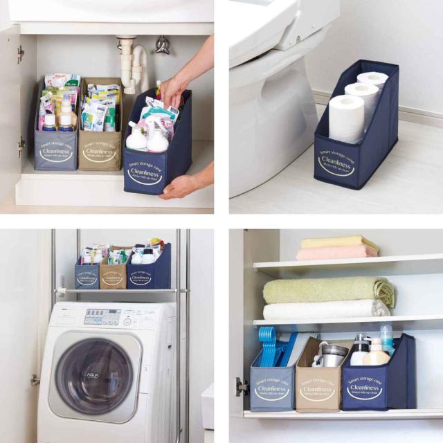 洗面台下のストック洗剤などをキレイに整理整頓できる、たためる洗面台下収納BOXです。洗面台下以外にも、トイレサイドのトイレットペーパー入れや空きスペースの小物収納など幅広くお使いいただけます。おしゃれなロゴ入りです。