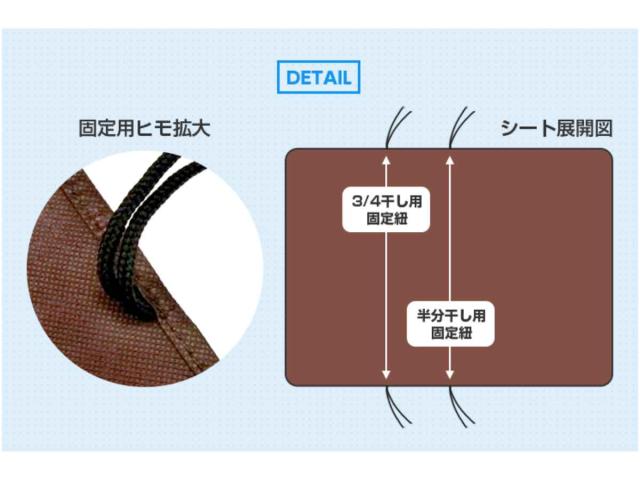 固定用のひもの留め位置で、布団に日があたる面積を変えられます。用途に応じて、半分干し、4分の3干し、使い分けることができます。