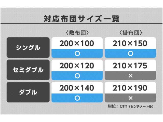 ●シングルサイズの敷き布団、掛け布団や、ダブルサイズの敷き布団に対応しています。