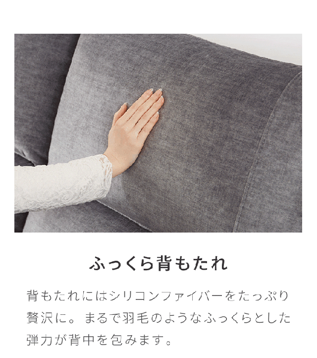 座面部はヴァージンウレタン(高密度ウレタン)の上に一層のシリコンファイバーがあることで羽毛のようなふわっとしたタッチ感を実現。