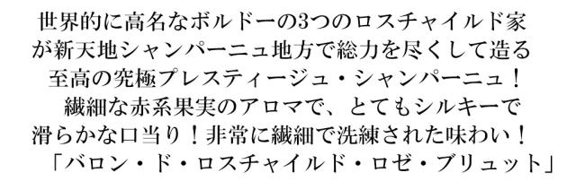 世界的に高名なボルドーの3つのロスチャイルド家が新天地シャンパーニュ地方で総力を尽くして造る至高の究極プレスティージュ・シャンパーニュ!繊細な赤系果実のアロマで、とてもシルキーで滑らかな口当り!非常に繊細で洗練された味わい!「バロン・ド・ロスチャイルド・ロゼ・ブリュット」