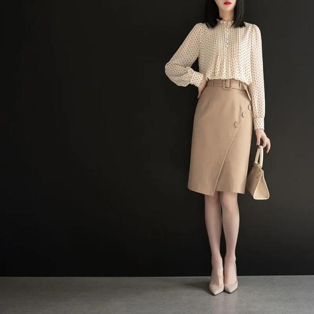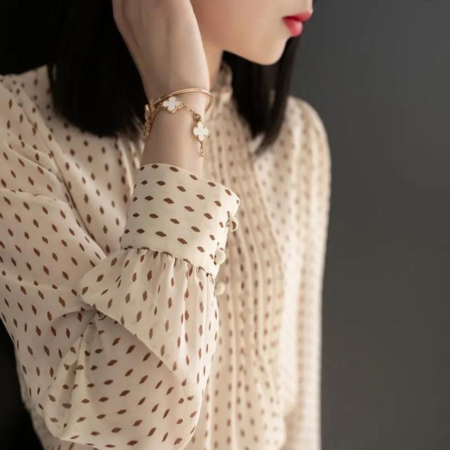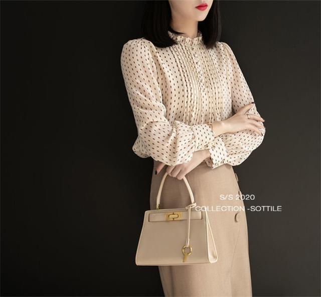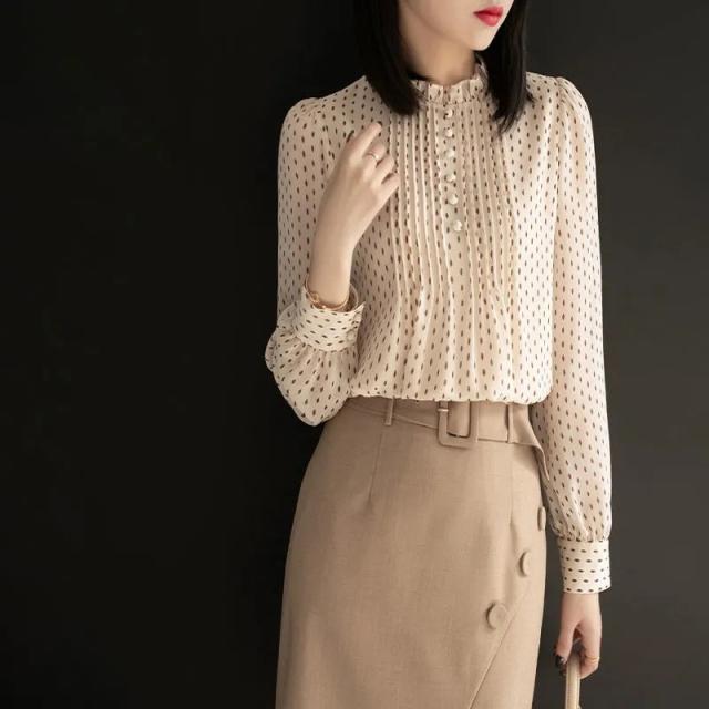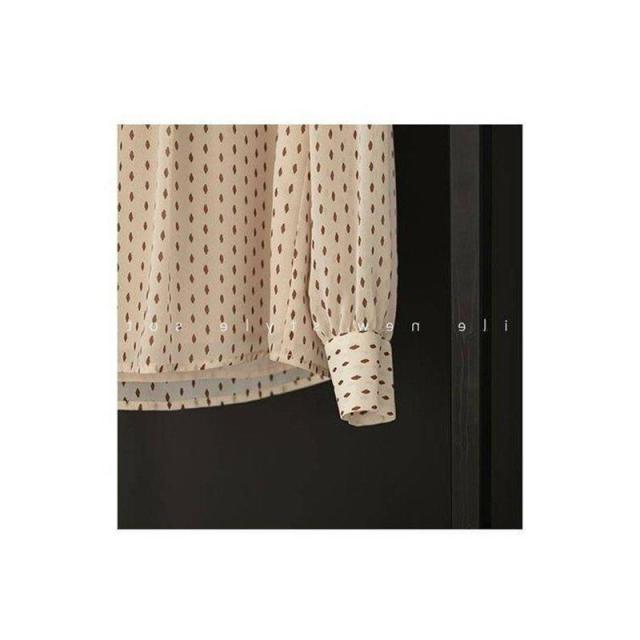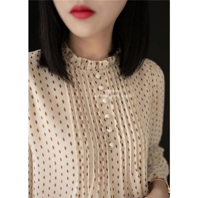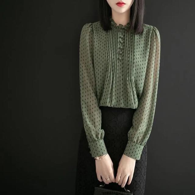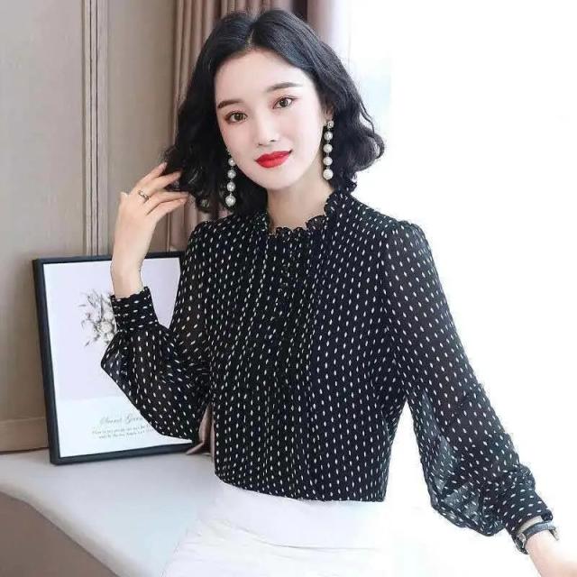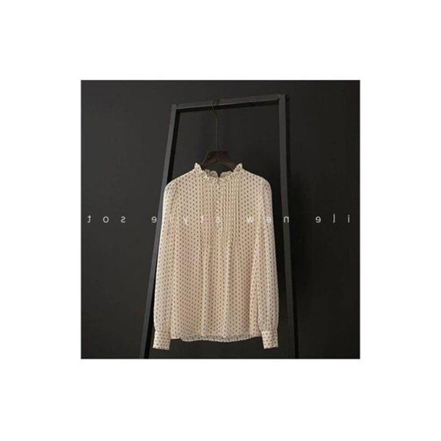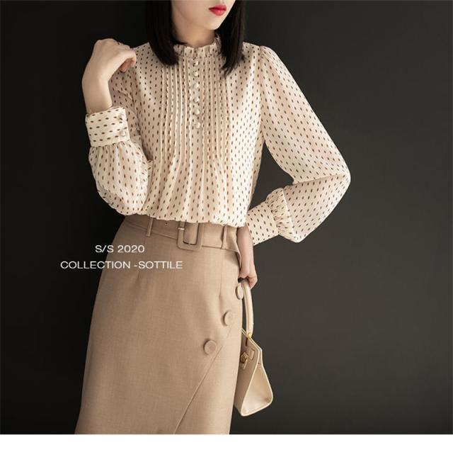 ブラウス レディース シャツ 長袖 オフィスブラウス シフォン 春秋 ハイネック ドット柄 フリル ゆったり 大きいサイズ 韓国風