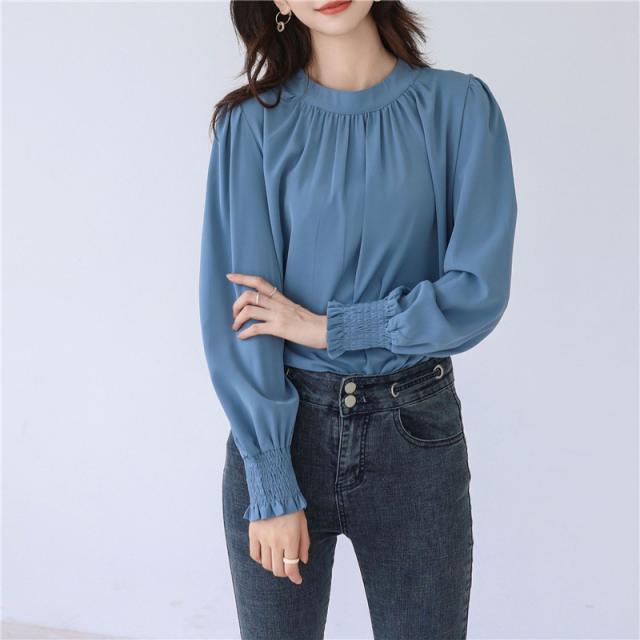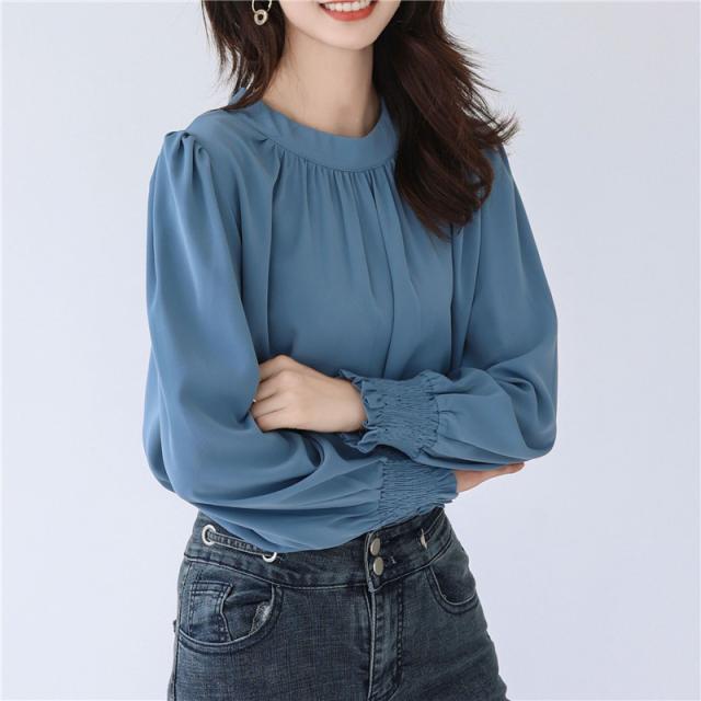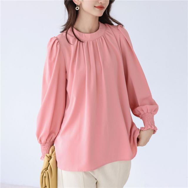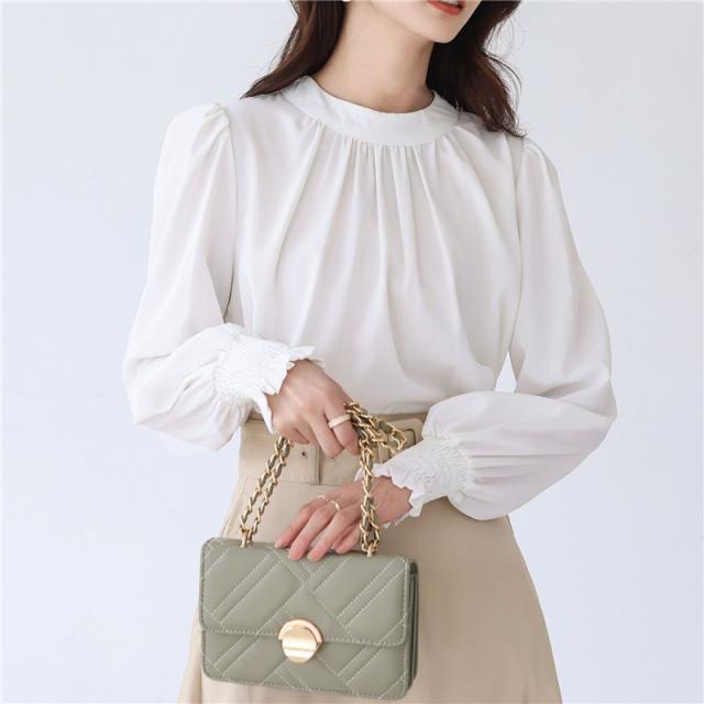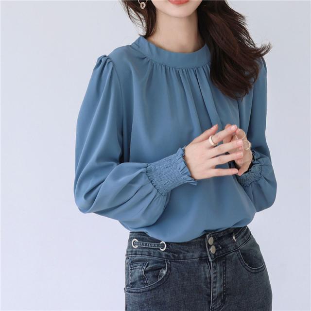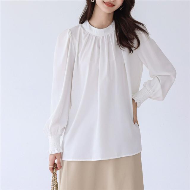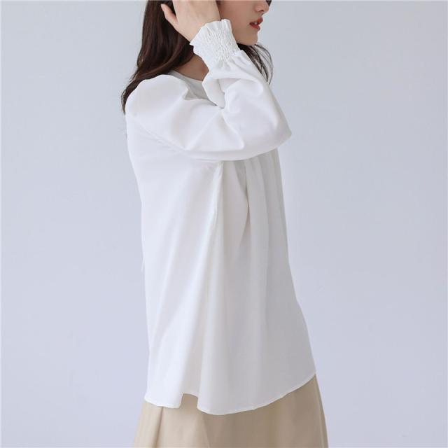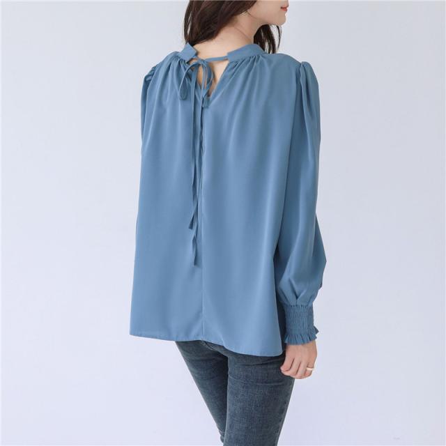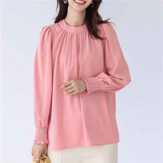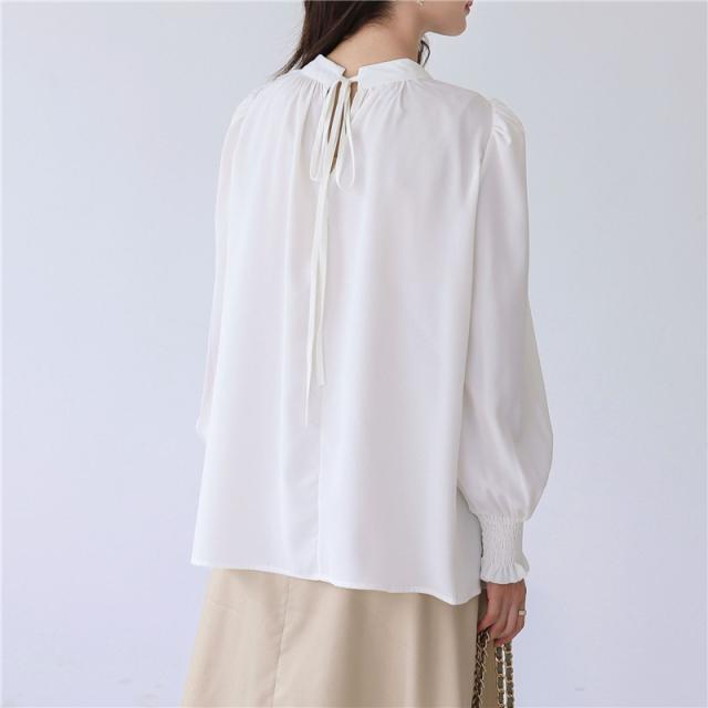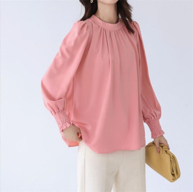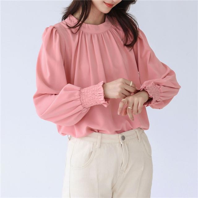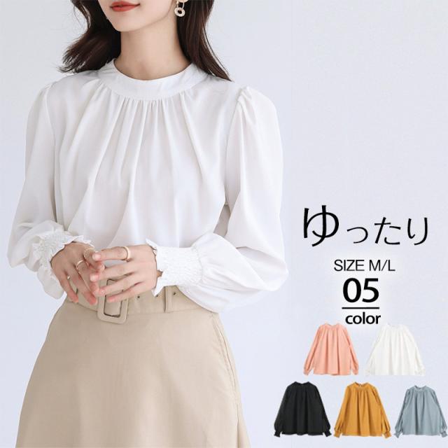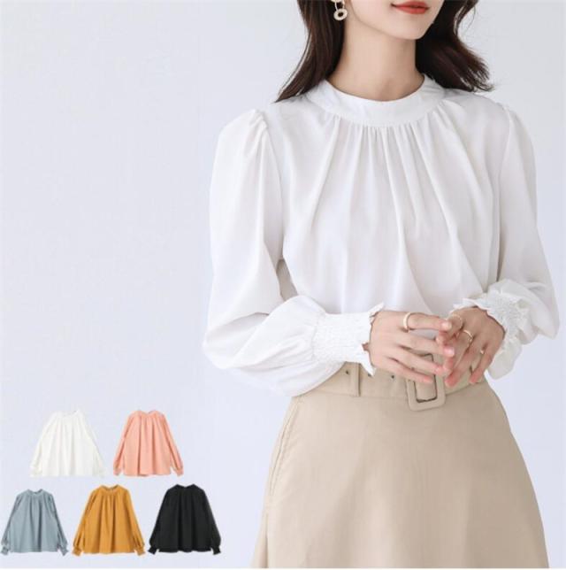 ブラウス レディース シャツ 長袖 オフィス ハイネック スタンドカラー クルーネック パフスリーブ ゆったり 無地 フリル 通勤