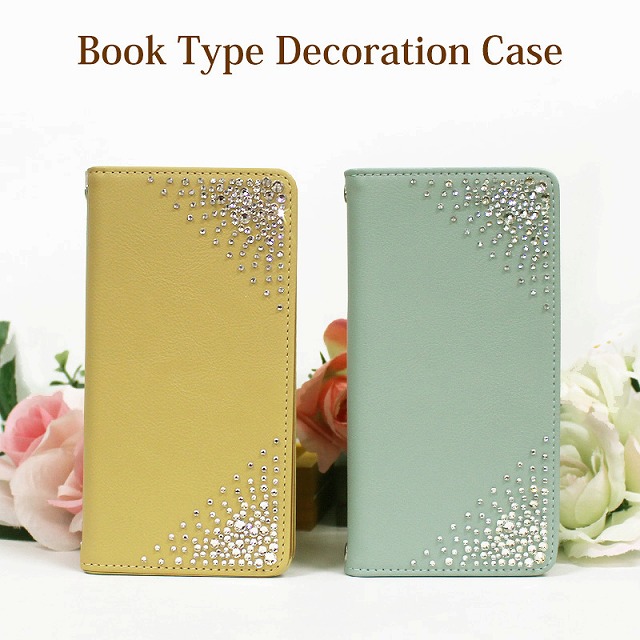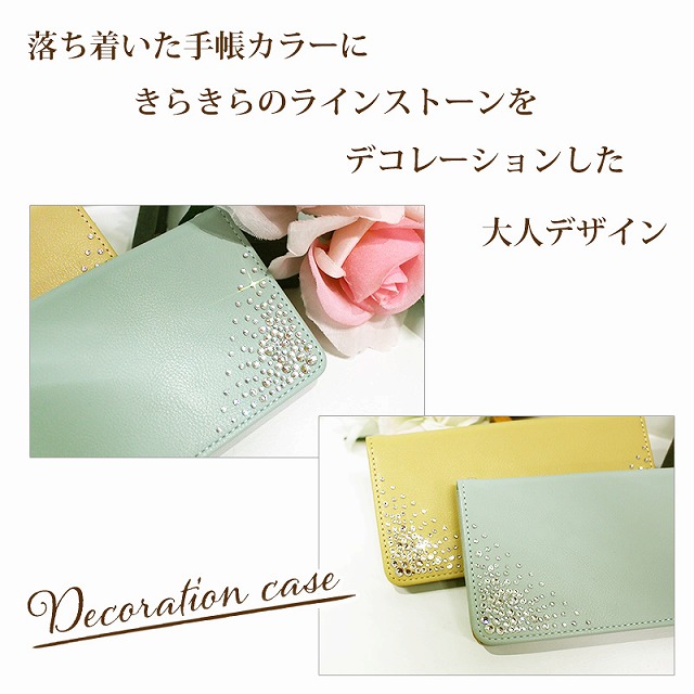くすみカラーの手帳にラインストーンを散りばめたスマホケースです。