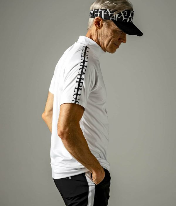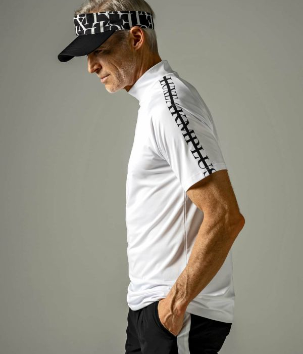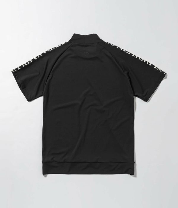 袖にブランドロゴをラインデザインで配置したモックネックTシャツ。