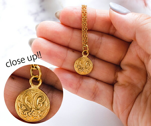 | 思ったより小さいけど、これくらいが良いかも...肌なじみの良い上品なサイズ。 丸いコイン型プレートにハワイアンの「スクロール」模様。 シンプルな飽きのこないデザインは、 おうち時間も、出かけるときも毎日お守りのように身につけられます。 いつも自分らしくナチュラルにいられる、 フォーマルにもつかえて重ねづけのできる大人カジュアルなペンダント。 | ||||