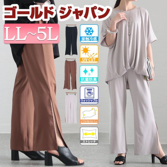 秋新作 大きいサイズ レディース ボトムス パンツ とろみ裾スリットパンツ ロングパンツ フレアパンツ スリットパンツ ロング フレア スリット とろみ ウエストゴム 無地 ルームウェア 春服 夏服 秋服 LL 2L 3L 4L 5L ブラック 黒 ブラウン グレージュ ゴールドジャパン