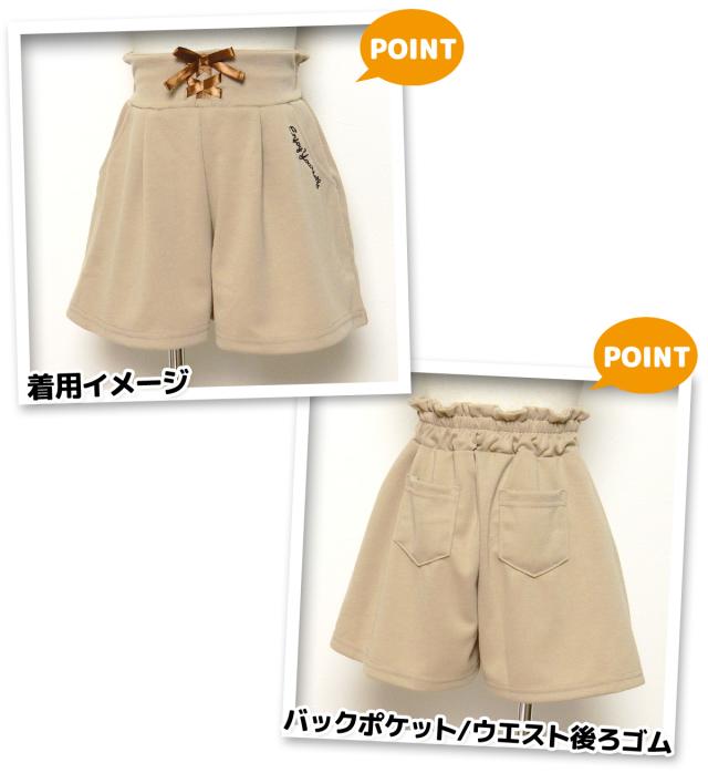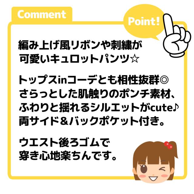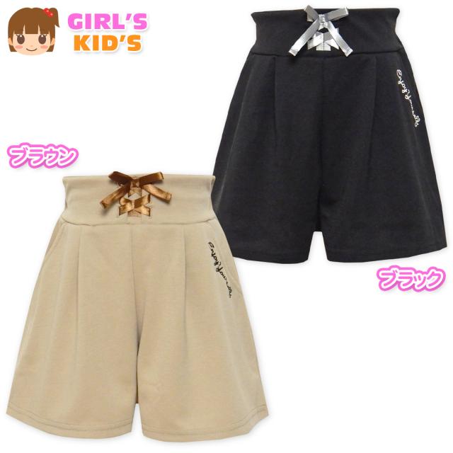 【送料無料】女児 キッズ ポンチ素材 キュロット 編み上げ風リボン 刺繍 ウエストゴム ボトムス 子供服 女の子 110cm 120cm 130cm nw-1010【メール便対応】