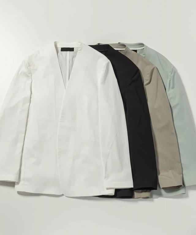 襟のない形状により、インナー次第で様々なニュアンスに変化。