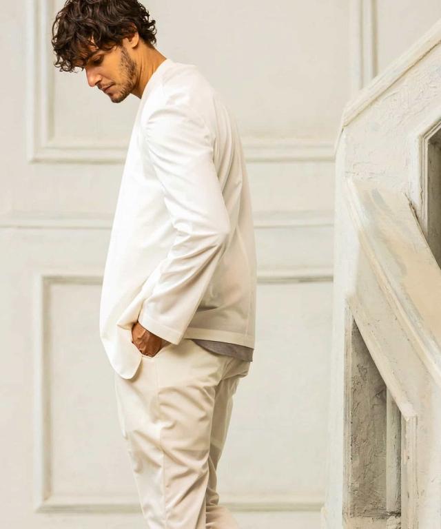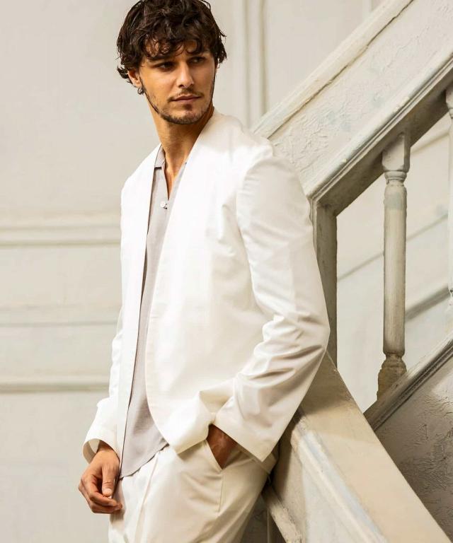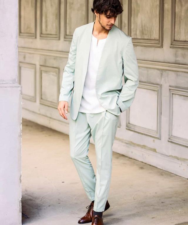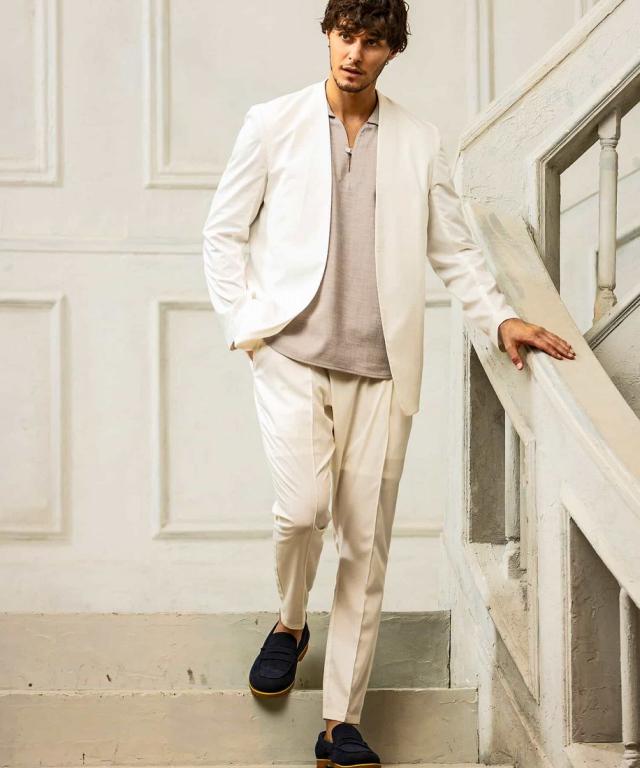 クリーンかつエレガントな雰囲気漂うノーカラージャケット。