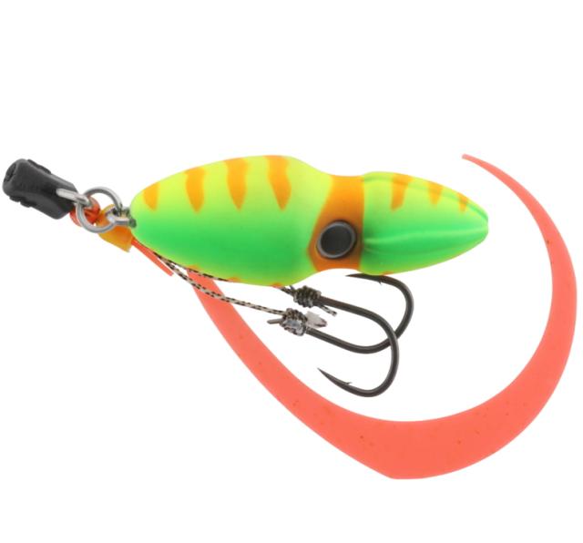 ヘッド、スカート、ネクタイが一連の従来の漁具型ルアーと異なり、ボディとネクタイ+フックを別パーツとして構成。さらに並列でセットしボリューム感を抑えたことでコンパクト化を実現。ボディへのバイトもフッキングに持ち込みます。
