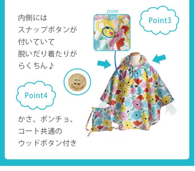 かさ、ポンチョ、コート共通のウッドボタン付き