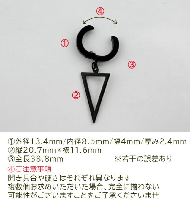 | ・イヤーカフ:外径13.4mm/内径8.5mm/幅4mm/厚み2.4mm ・三角形:縦20.7mm×横11.6mm ・全長:38.8mm ※若干の誤差あり |