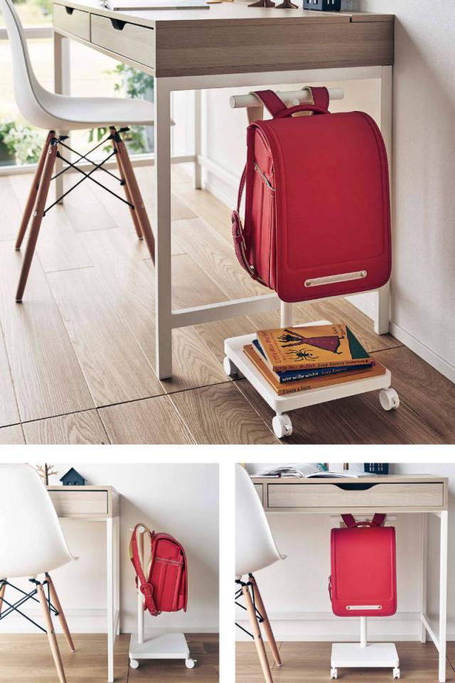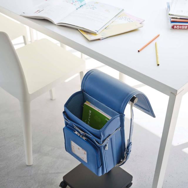 床やテーブルの上に置きっぱなしになりがちなランドセルを掛けて収納できるランドセル収納ワゴンです。テーブルのすぐ横にランドセルを収納して、学習の準備から片付けまでをスムーズに済ませることができるので、リビングやダイニングで勉強するお子様にピッタリです。