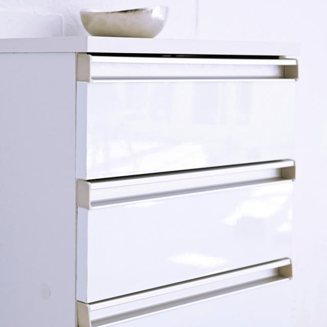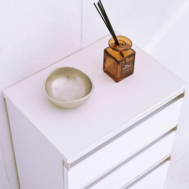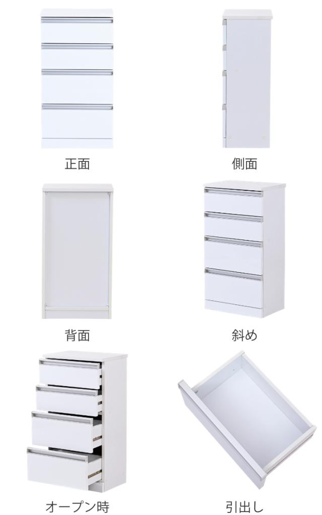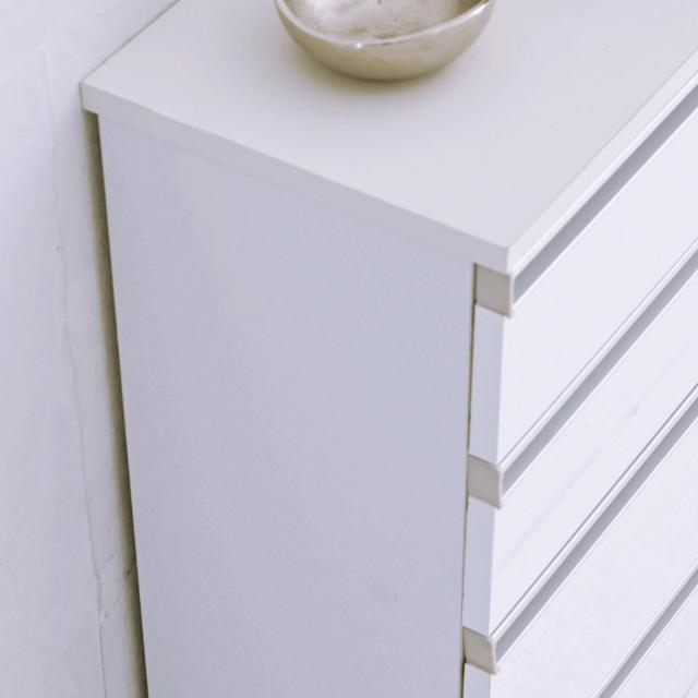 光沢感のあるホワイトが美しい4段タイプのチェストです。奥行28.5cmのスリム設計で圧迫感を感じにくいスッキリとしたデザインです。カウンター下などの限られた空間を有効活用し収納力をアップさせます。