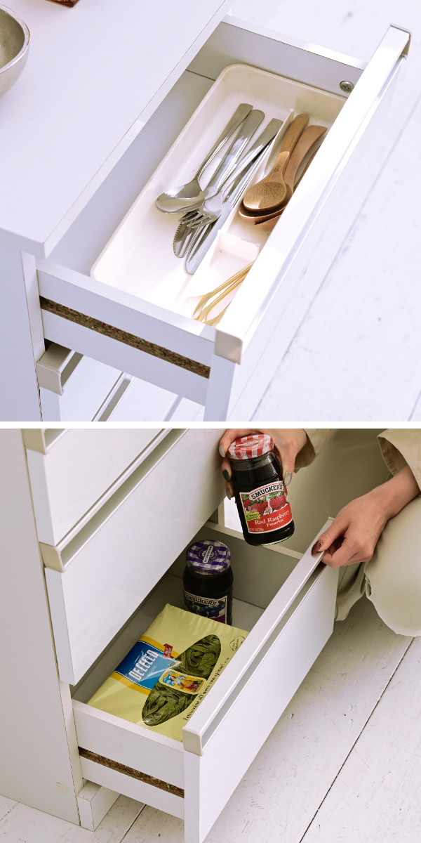 上2段はカトラリーや小物類、A4ノートも収納可能な浅型の引出しです。下2段は調味料やかさばるタオル類などの、日用品の収納に便利な深型サイズです。