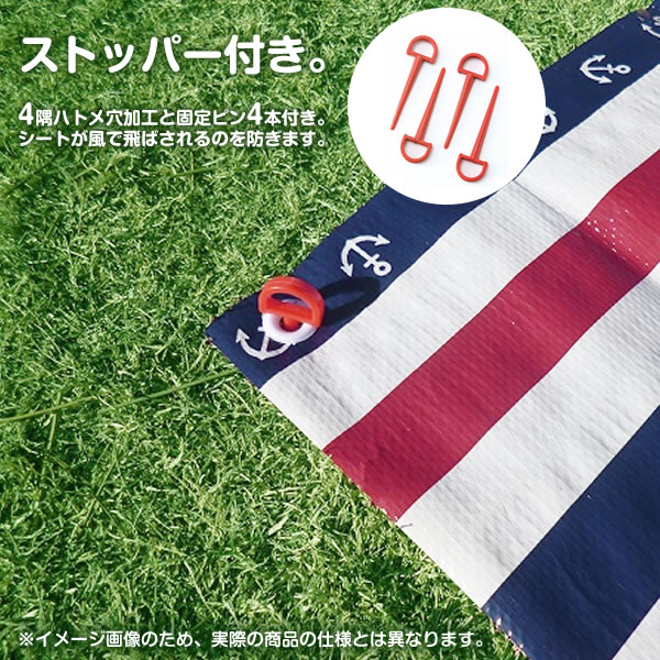 ストッパー付き4隅ハトメ穴加工とストッパー4本付きで、シートが風で飛ばされるのを防ぎます。