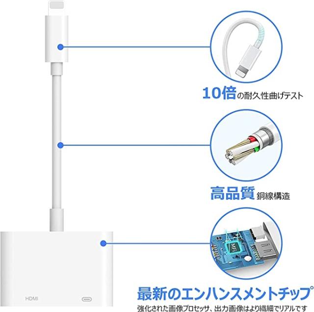 【幅広い互換性?プラグアンドプレイ対応】対応機種:Phone14/13/12/12 Pro / 12 Pro Max /Phone11/11 Pro/11 Pro Max、PhoneX/Xs、Phone 8/8 Plus、Phone 7/7 Plus、Phone 6 s/6 s Plus/6 Plus、Phone 5/5 s/SE、Pad mini/mini 2/mini 3/mini 4/Air 4/Air 2/Pad 3など(iOS12以上、最新のiOS14と15にも完全対応)、ライトニング端子がある全てのデバイスに対応できます。このPhone HDMI 変換アダプタはわずらわしい給電が不要!HDMIケーブルと挿すだけで使える!