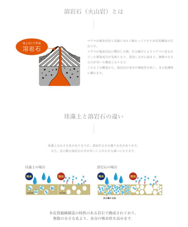 マグマが地表付近で急激に冷えて固まってできた多孔質構造の岩石です。マグマが地表付近に噴出した際、圧力減少によりマグマに含まれていた揮発成分が気体となり、発泡しながら固まり、無数の小さな穴が空いた構造となります。このような構造から、溶岩石は水分の吸収性が高く、また乾燥性に優れます。