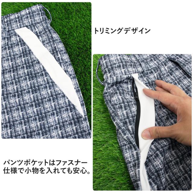 | 特徴 | ゴルフウェアブランド GIORNO SEVEN(ジョルノセブン) 注目のモックネックシャツとハーフパンツの上下セットアップ。 吸汗速乾ドライメッシュで快適サラサラの肌触りで ストレッチも抜群。 ツイード調の総柄とロゴ総柄で白のトリミングライン。 トップスは胸ワッペン刺繍が施されています。 パンツポケットはファスナー仕様。 ウエストはゴム仕様でひもで調整でき、 ベルトループ付きでベルトを通すことも可能。 単品での着用もおすすめ。 |