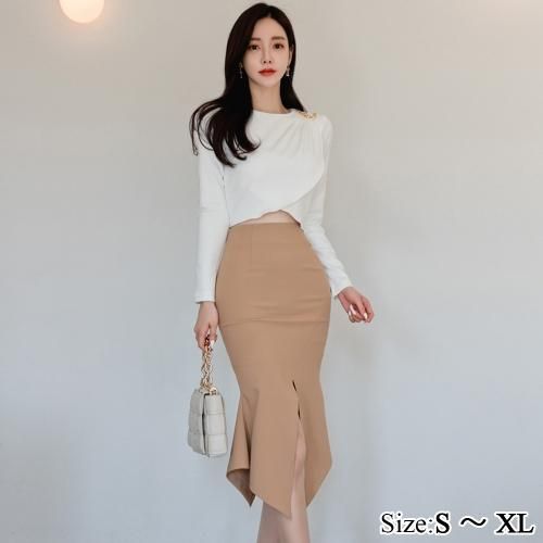 合わせるスカートはスリットが深めのタイトスカート。