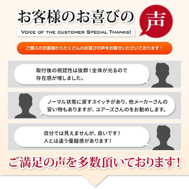 ■車検の際はスイッチをOFFにして車検を受けてください。スイッチOFFにて純正の状態になります。 ■いかなる場合も、車体側・工賃の保証は致しませんのでご了承ください。 ■不具合等がございましたらご購入サイトまでご連絡ください。 ■本品またはご使用の際のキズ・破損等に対する保証はございません。ご使用は自己責任にてお願い致します。 |