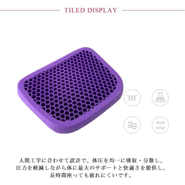 | 椅子用のクッションや座布団としても最適! 高品質ジェル素材使用、通気性抜群。 人間工学に合わせて設計で、体圧を均一に吸収・分散し、 圧力を軽減しながら体に最大のサポートと快適さを提供し、長時間座っても疲れにくいです。 暑さを吸収・分散してサポートし正しい姿勢を保ちます。 柔ら材質で椅子にも使えます、平らな椅子の表面に直接座るよりも座り心地がよい。 クッション本体もカバーも丸洗いできるから、万が一飲み物をこぼしても安心。 耐久性の高い素材TPEを採用することで永くご使用頂くことが可能です。 | |