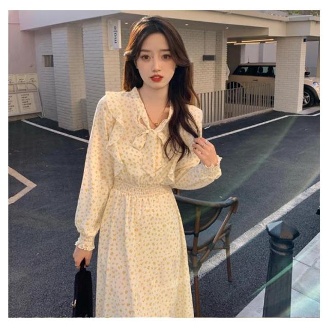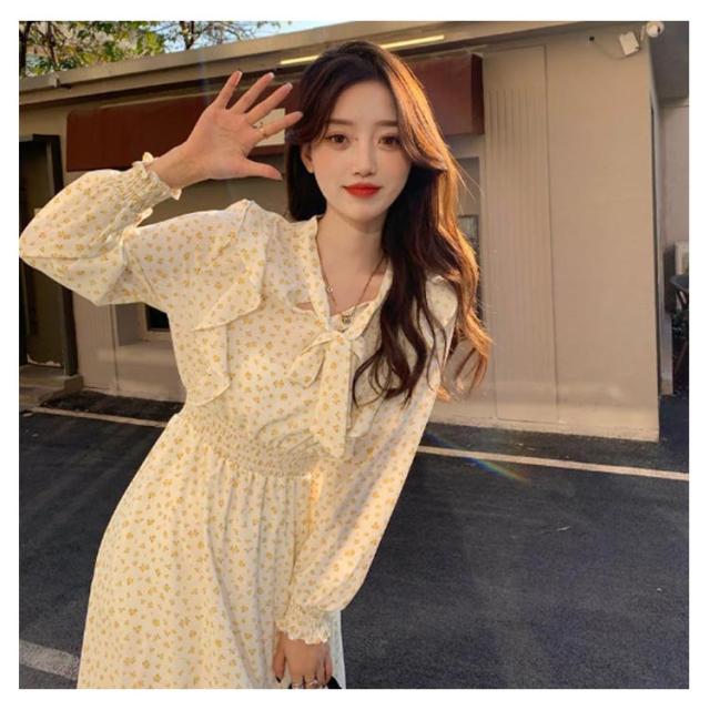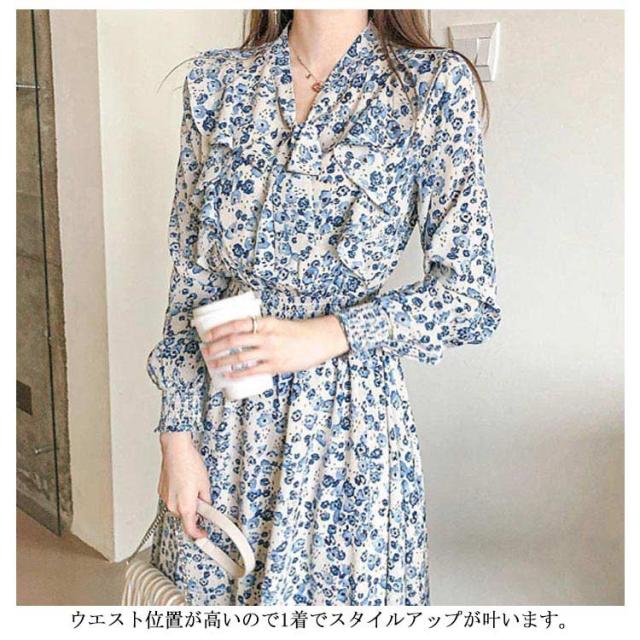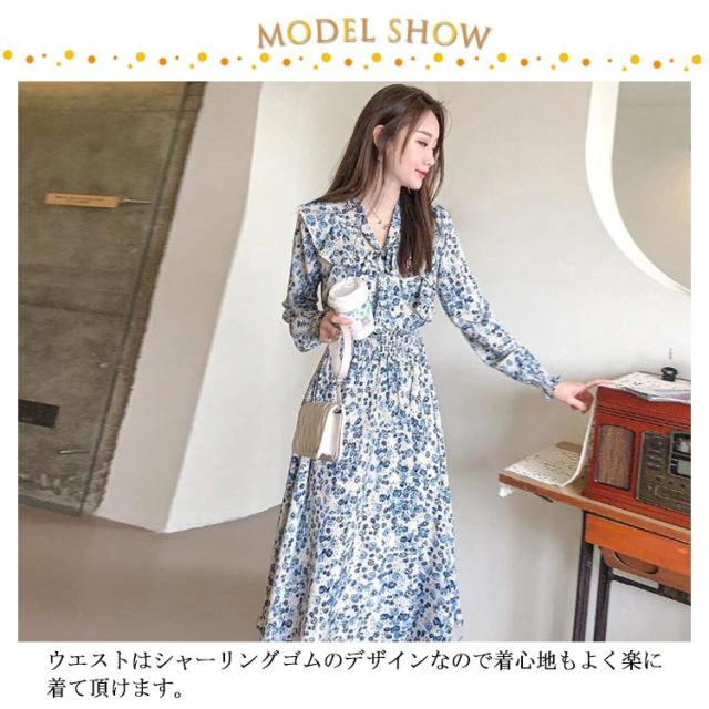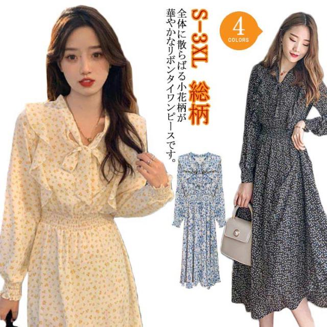 長袖 ワンピース リボンタイ レディース 花柄 総柄 フリル ロングワンピース ミモレ丈 ボウタイ シャーリング 裏地付き シフォン シースルー 大きいサイズ ブルー ブラック ホワイト イエロー かわいい 体型カバー S M L XL 2XL