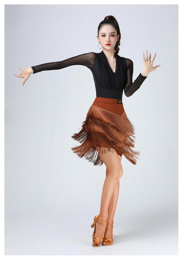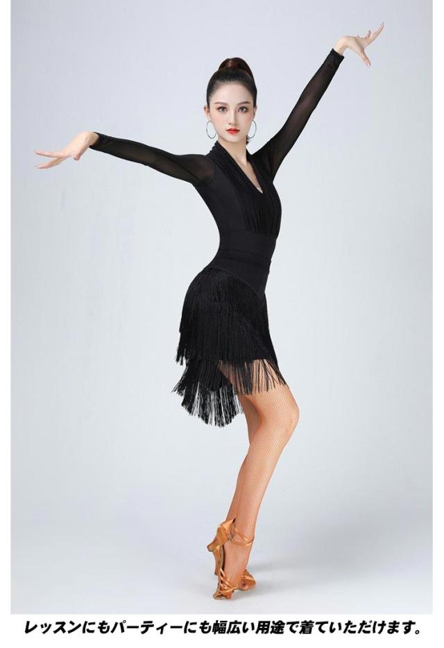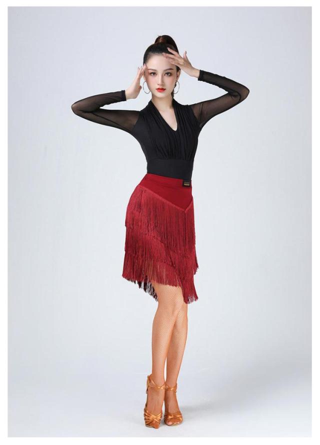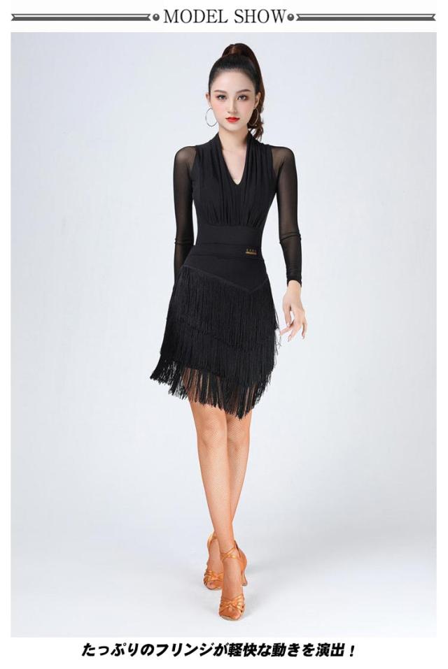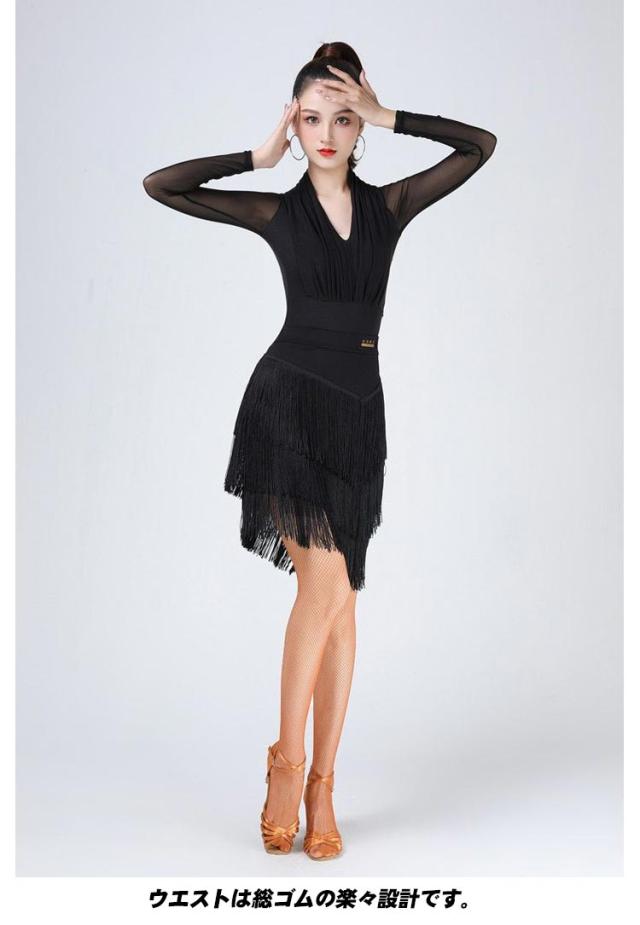 ダンススカート フリンジ付き ダンス衣装 スカート フリンジスカート トップス 長袖 Vネック レッスンウエア 社交ダンス ラテンダンス モダンダンス ジャズダンス 競技 練習着 大きいサイズ 無地 全4色