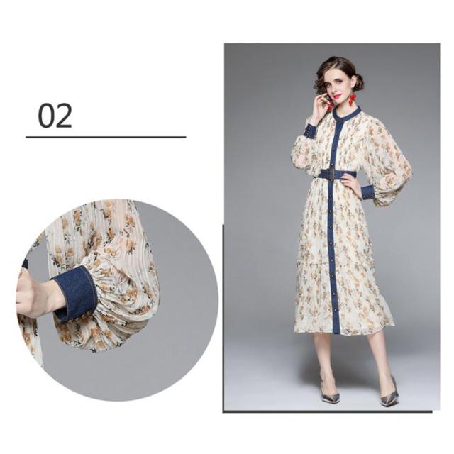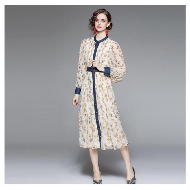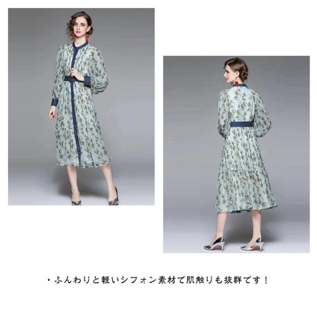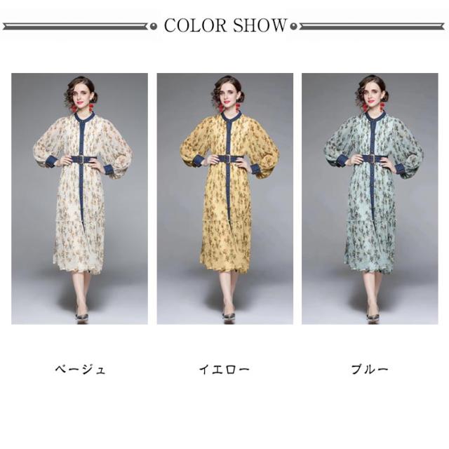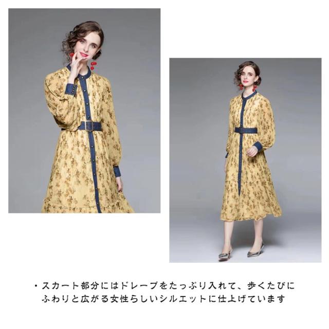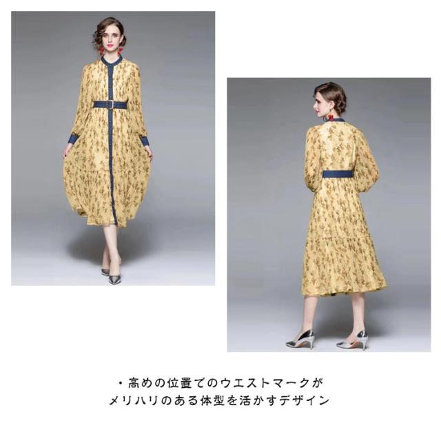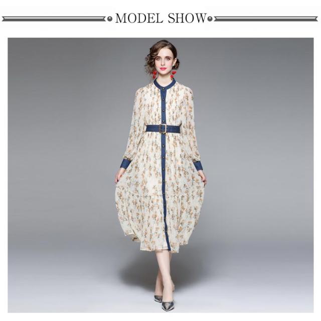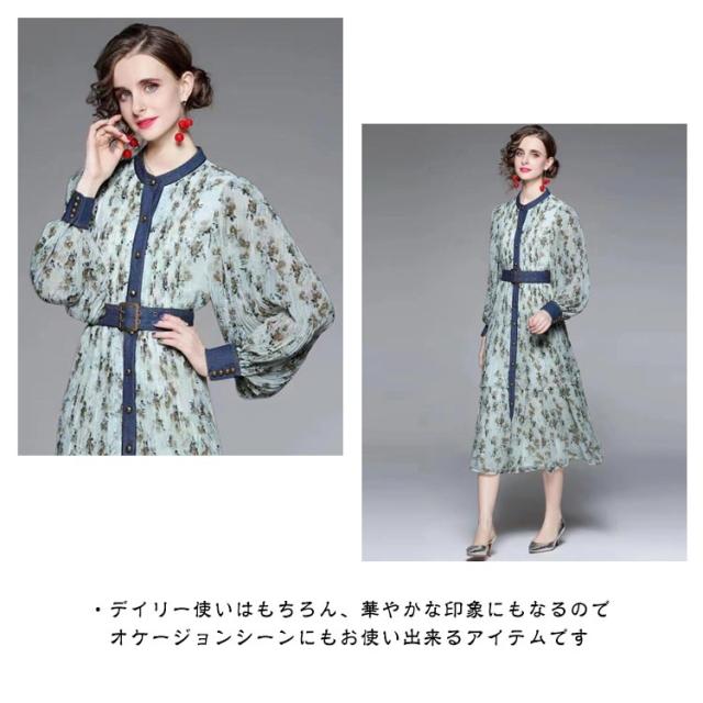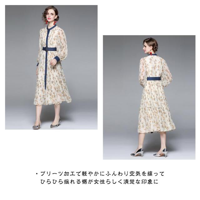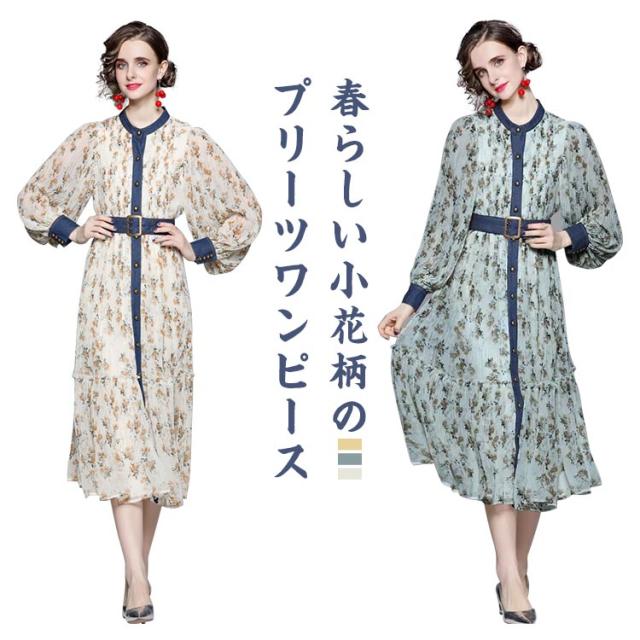 ロングワンピース プリーツワンピース 花柄 ベルト付き Aライン 長袖 ボリューム袖 異素材 切り替え 配色 総柄 フロントボタン おしゃれ きれいめ 春 全3色