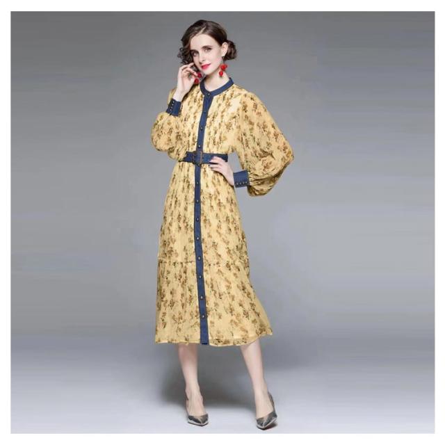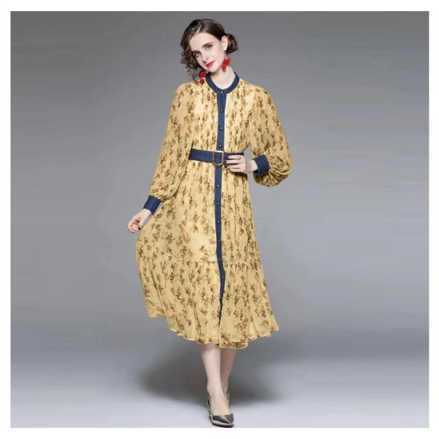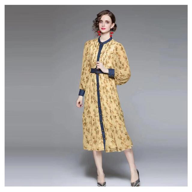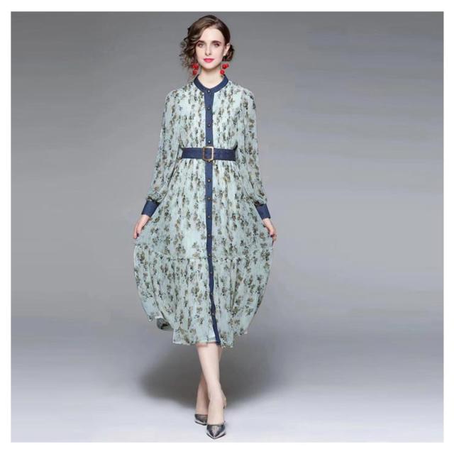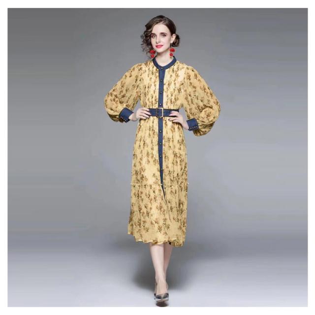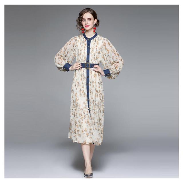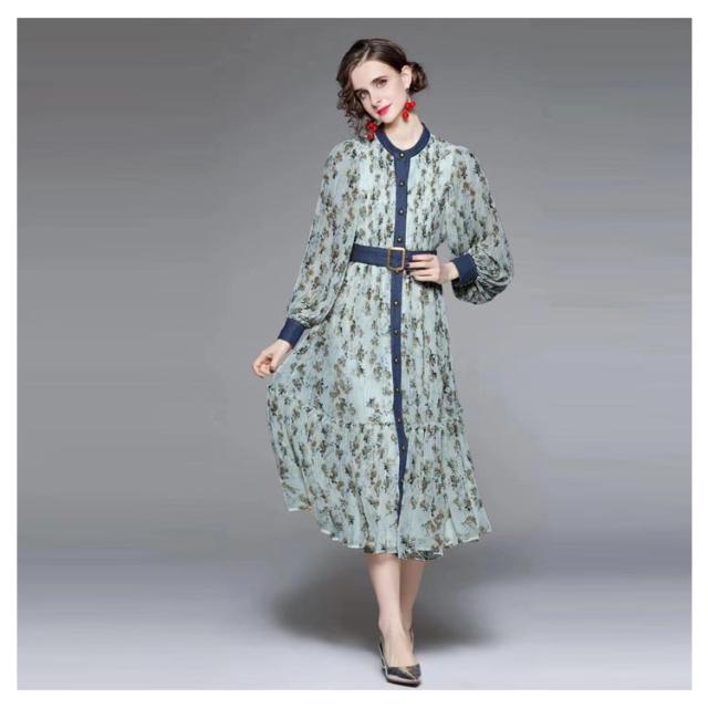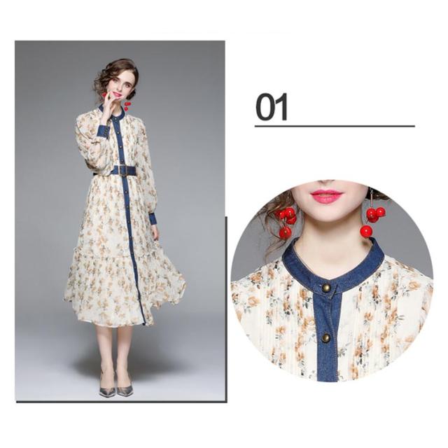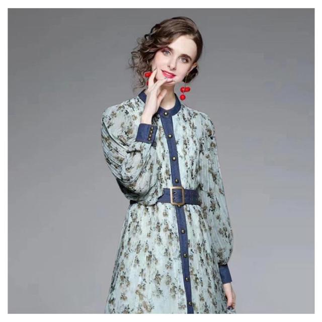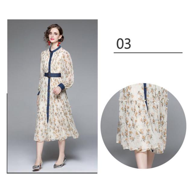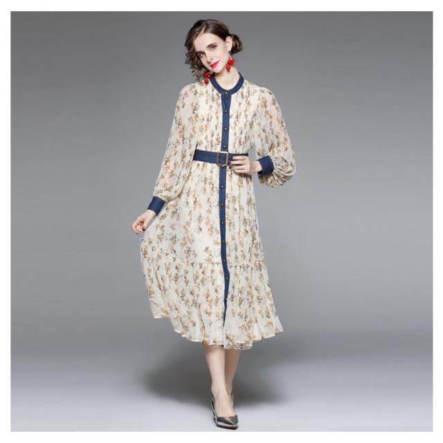 ロングワンピース プリーツワンピース 花柄 ベルト付き Aライン 長袖 ボリューム袖 異素材 切り替え 配色 総柄 フロントボタン おしゃれ きれいめ 春 全3色