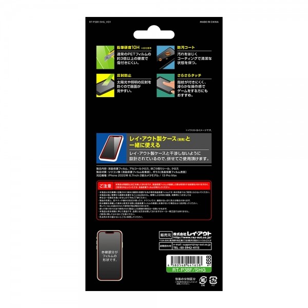 | 主な仕様 | 対応機種: iPhone 14 Plus/13 Pro Max メーカー製品型番: RT-P38F/SHG 素材: シリコン膜(液晶保護フィルム吸着面)、ガラス(液晶保護フィルム表面) |