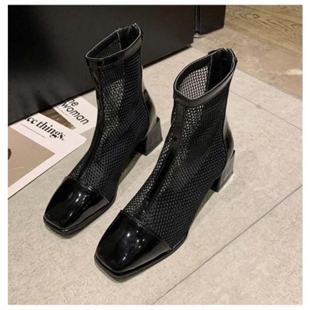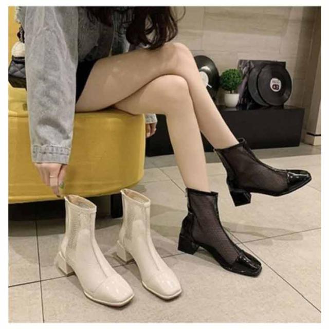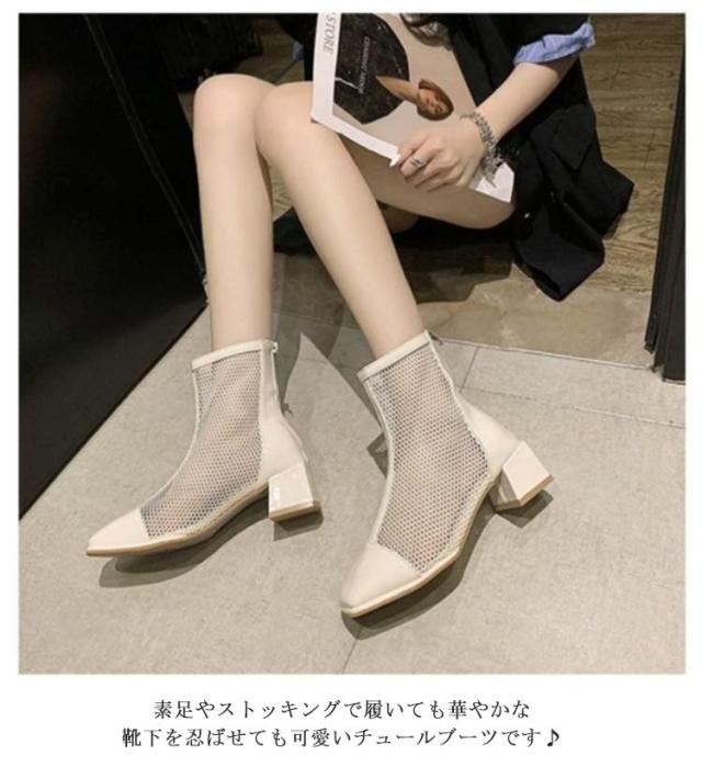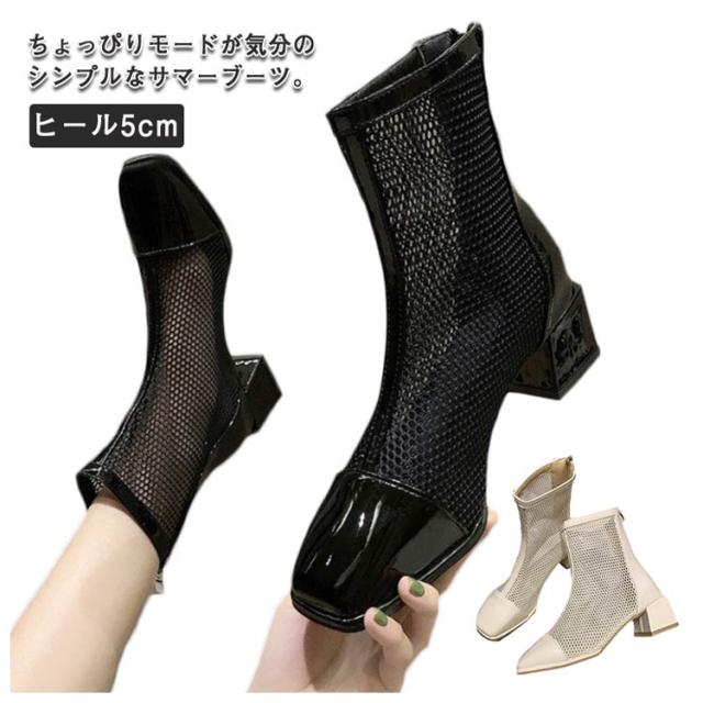 ブーツ レディース メッシュ サマーブーツ 透け ショートブーツ スクエアトゥ チュールブーツ 夏 美脚 ブーツサンダル 通気 バックジップ ヒール5cm 太ヒール 大きいサイズ 歩きやすい 痛くない