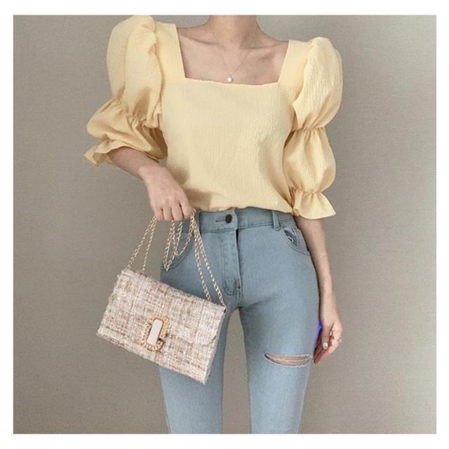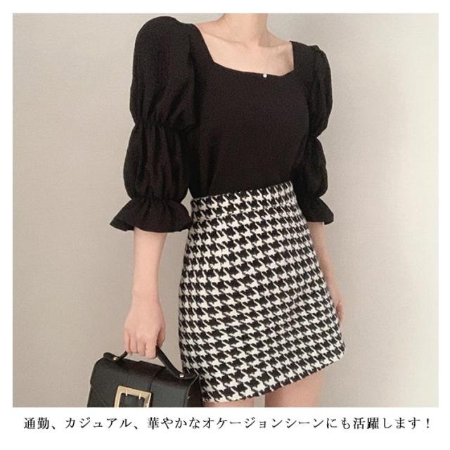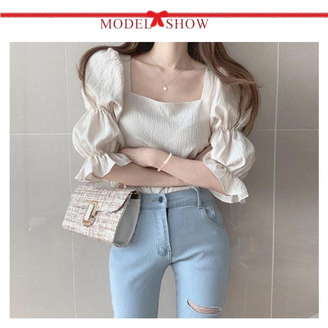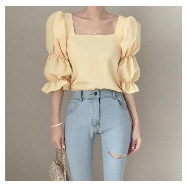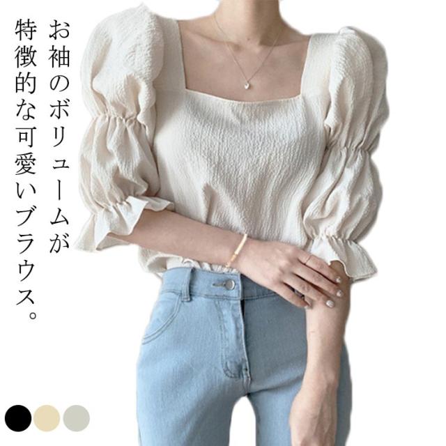 ブラウス レディース 五分袖 半袖 バルーン袖 パフ袖 春 夏 スクエアネック 韓国 ファッション お洒落 プルオーバー シフォン ティアード ブラウス キャンディスリーブ ボリュームスリーブ エレガント 通勤 送料無料