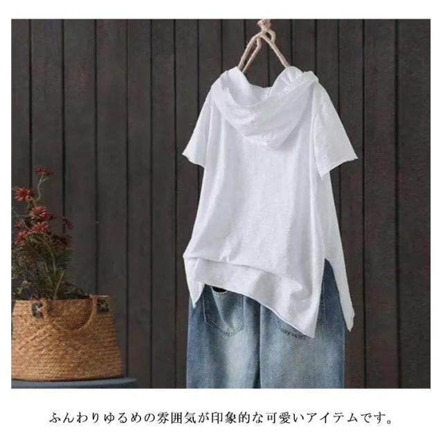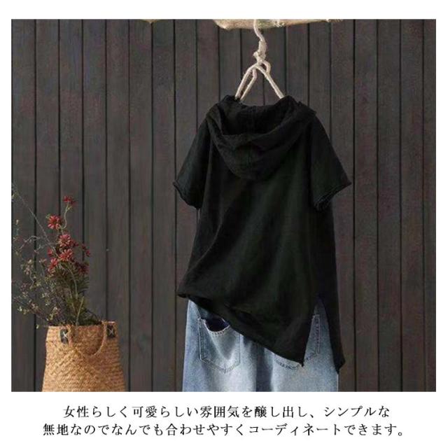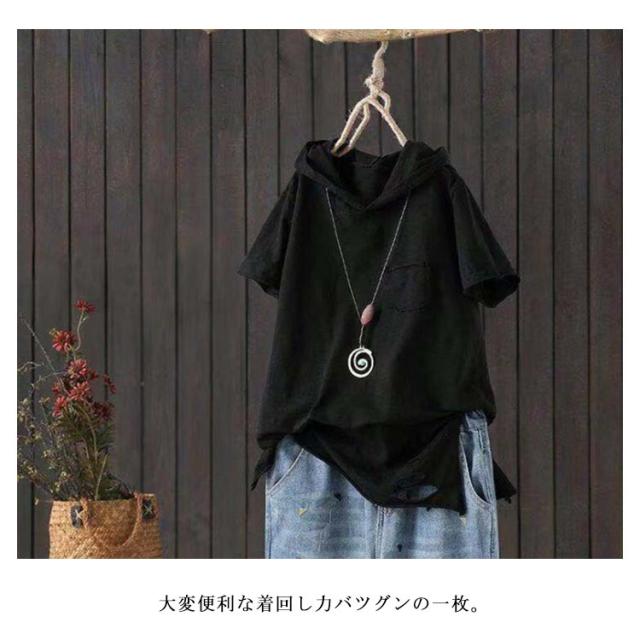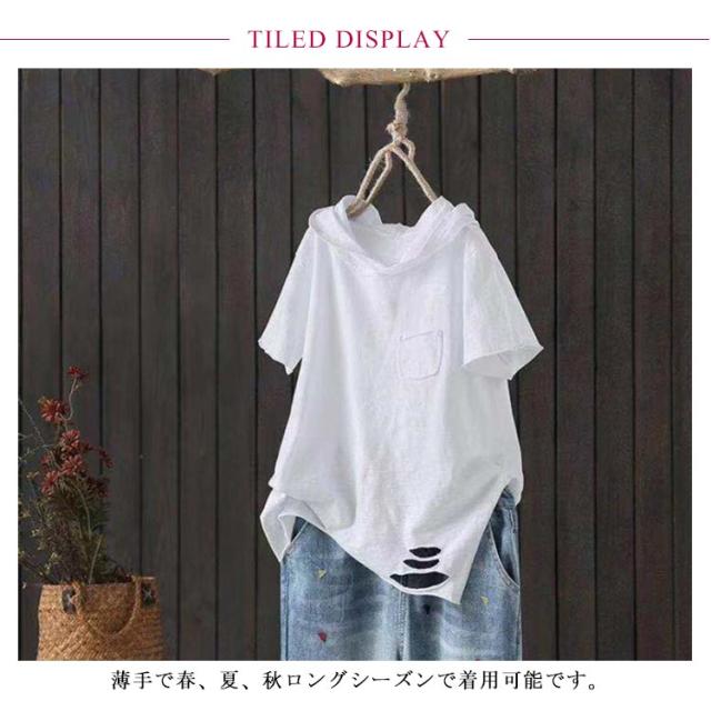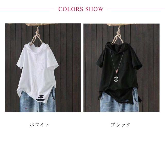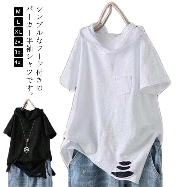 tシャツ レディース 半袖tシャツ 綿 コットン 春服 夏服 薄手 ロングt ロングtシャツ Tシャツ パーカー パーカーtシャツ パーカ プルオーバー カットソー ホワイト ブラック 黒 白