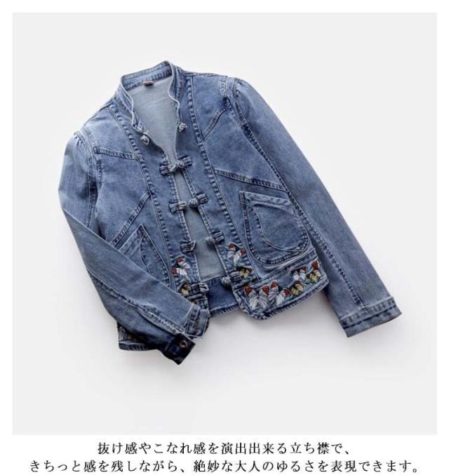 送料無料 デニムジャケット 刺繍 春新作 レディースアウター エスニック系 チャイナボタン 長袖 Gジャン 立ち襟 ジャケット ブルゾン 刺繍ジャケット 春 秋 30代 40代 50代