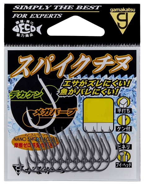 大きなカエシの「メガバーブ」により、掛けたチヌのバラシを防ぐ!最大の特徴は、従来のチヌ鈎のカエシよりも大きな「メガバーブ」を採用することにより、掛けた魚をガッチリキープ。特にシモリ周りでのラインテンションをコントロールしながらのやり取りや、春先の藻が多く生えた釣り場でのラインテンションの緩みによるバラシを軽減。軸部には大きなケンの「デカケン」を採用し、「メガバーブ」との相乗効果により、遠投や強風時の強い振り込みでのサシ餌のズレを軽減。形状はスタンダードなシワリとヒネリを採用し、チヌの口元をしっかり捕らえ、高い貫通性能を誇る「ナノスムースコート」がチヌの分厚い唇を確実に貫きます。