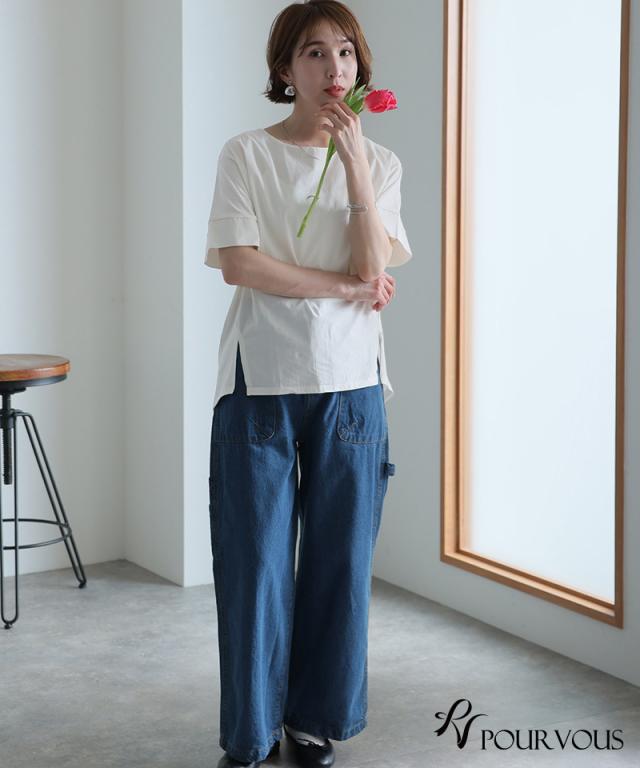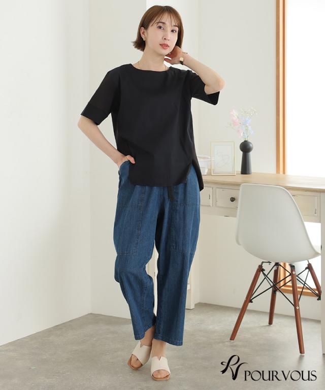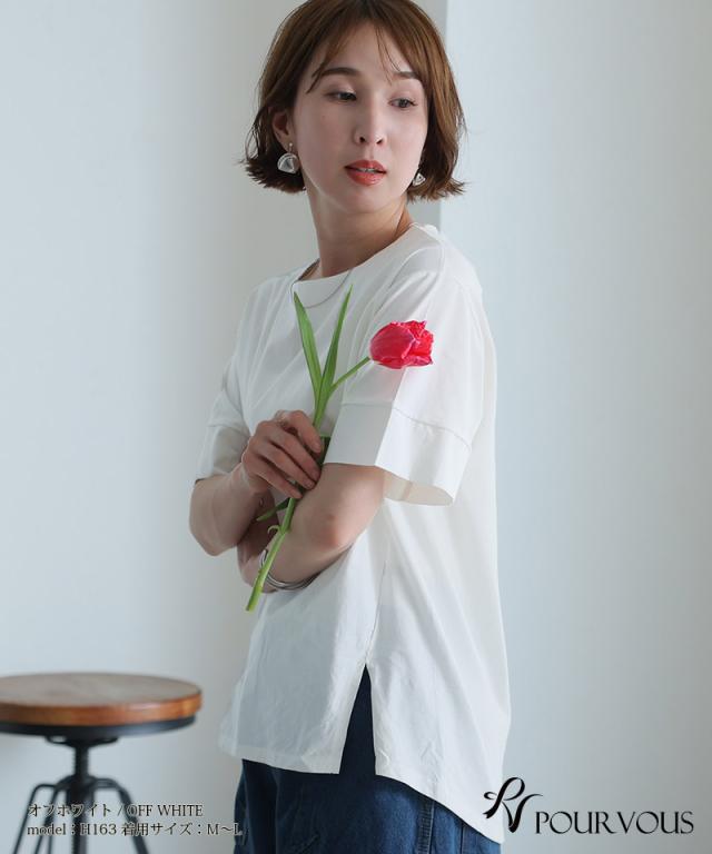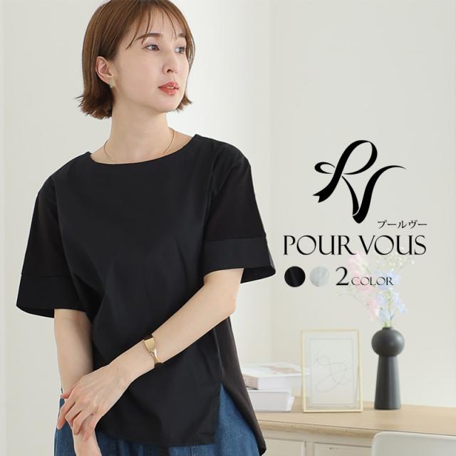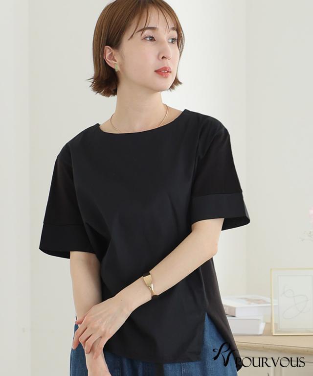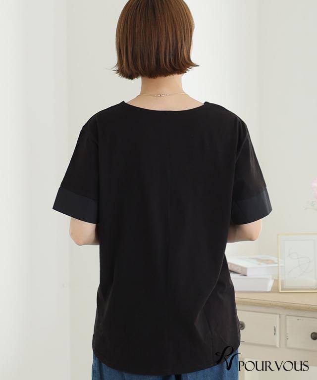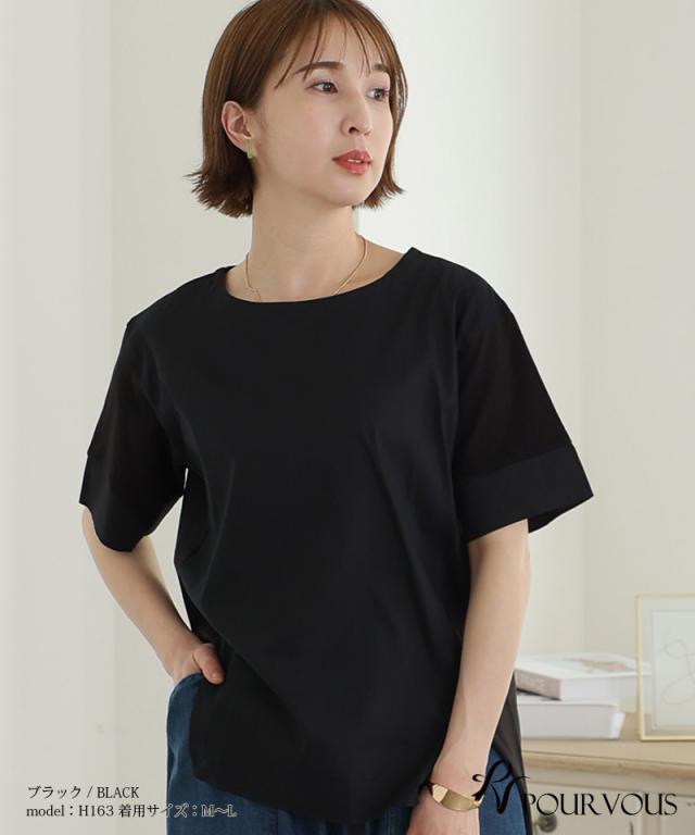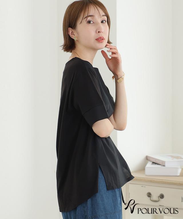 異素材切り替え半袖Tシャツ【634231326】 20代・30代・40代・50代トップス・レディース・カジュアル・半袖・長袖・七分・ノースリーブ・肩出し・Vネック・シンプル・薄手・厚手・無地・刺繍・花柄・可愛い・伸縮性・キレイめ・着やせ・重ね着風・新作・レース・上品・セットアップ・ビジュー・体型カバー・スタイルアップ・小さいサイズ・3Lや9L・即日発送・送料無料・オフィス・ワーク・オールシーズン・デイリー・普段着・オケージョン・セミフォーマル・婚活・顔合わせ・同窓会・お呼ばれ・食事会・謝恩会・親族・七五三・お宮参り・冠婚葬祭・弔事・女子会・デート・入学式・卒業式・入園式・ママ